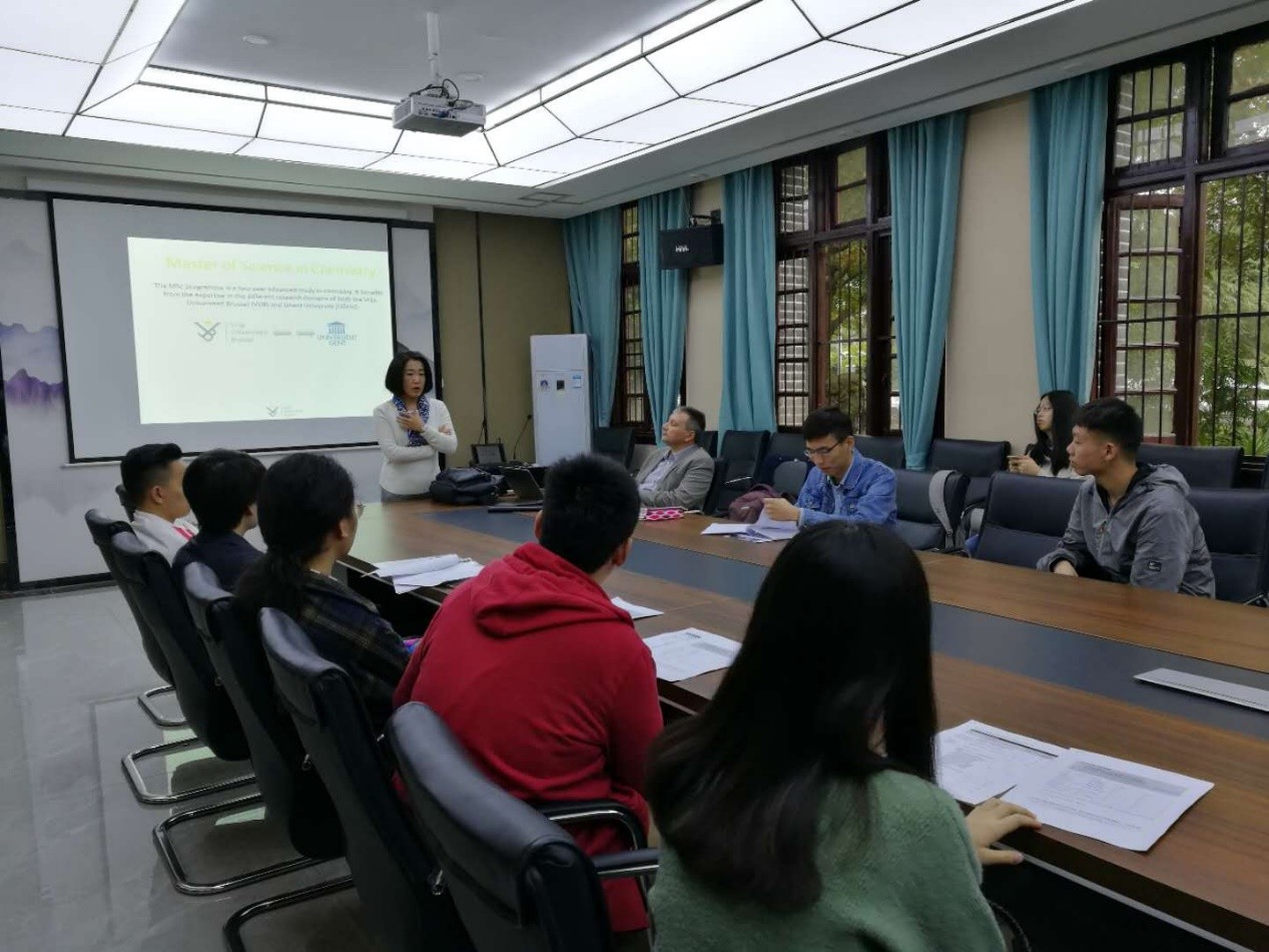 首先,Prof. Elskens为大家介绍了布鲁塞尔自由大学的化学学科的自由与民主,在这所大学中展现了无限的包容力和创造力。Elskens教授为大家着重介绍了布鲁塞尔自由大学化学系的研究重点,分别列举了在这些方面有所成就的教授以及他们的主要工作。在介绍研究重点之后,Prof. Elskens给大家展示了实验室硬件条件,这都为学生的课程与发展创造了丰富的条件。最后,Prof. Elskens给学生们讲授了课程安排、学分分配、毕业后的就业工作情况等一系列信息,让同学们对出国留学的情况以及未来的发展方向有了一个更加清晰的认识。在Prof. Elskens的报告后, Prof. Gao为同学们具体的介绍了四川大学与VUB大学3+2项目化学专业的相关信息。两场报告风趣幽默,为在座的同学们提供了宝贵的信息。在自由提问环节,同学们向教授提出自己想要进一步了解的内容,教授们认真细致的做出了解答。教授还留下了每一位同学的信息,希望可以和同学们有更加深入的讨论交流。在同学们热烈的掌声中,此次报告落下了帷幕。结束后部分同学和教授进行更为深入的沟通。