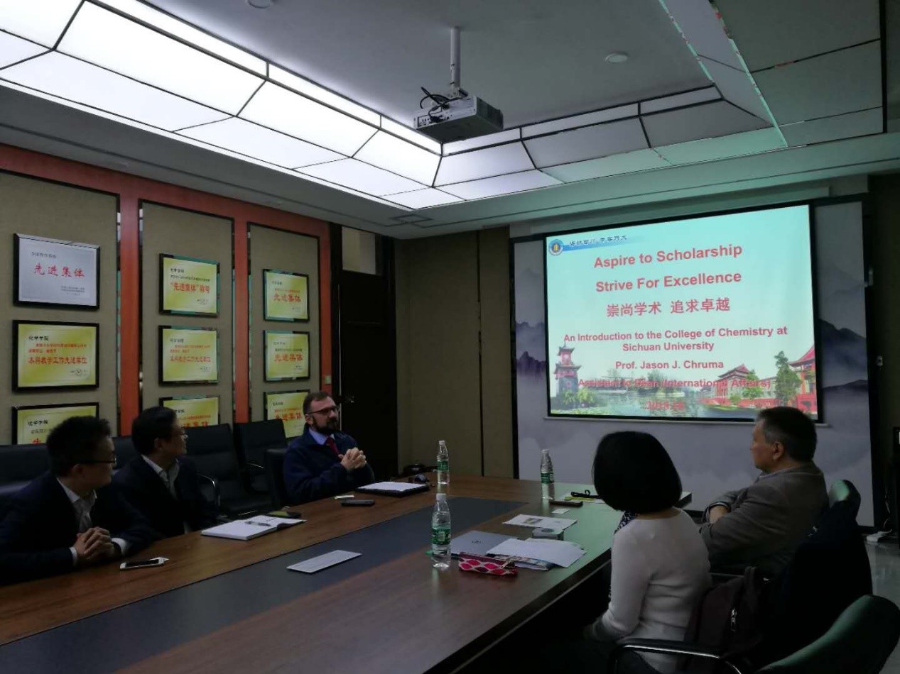之后,双方学院领导进行了充分交流和沟通,川大化学学院王智猛书记,院长助理Jason Chruma教授和杨成教授参加了会谈,双方对下一步合作交流及联合培养有了初步意向。