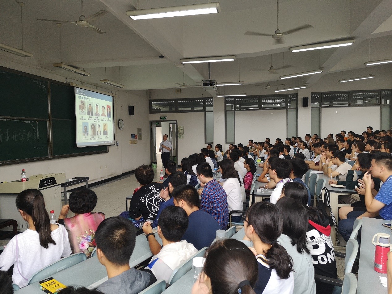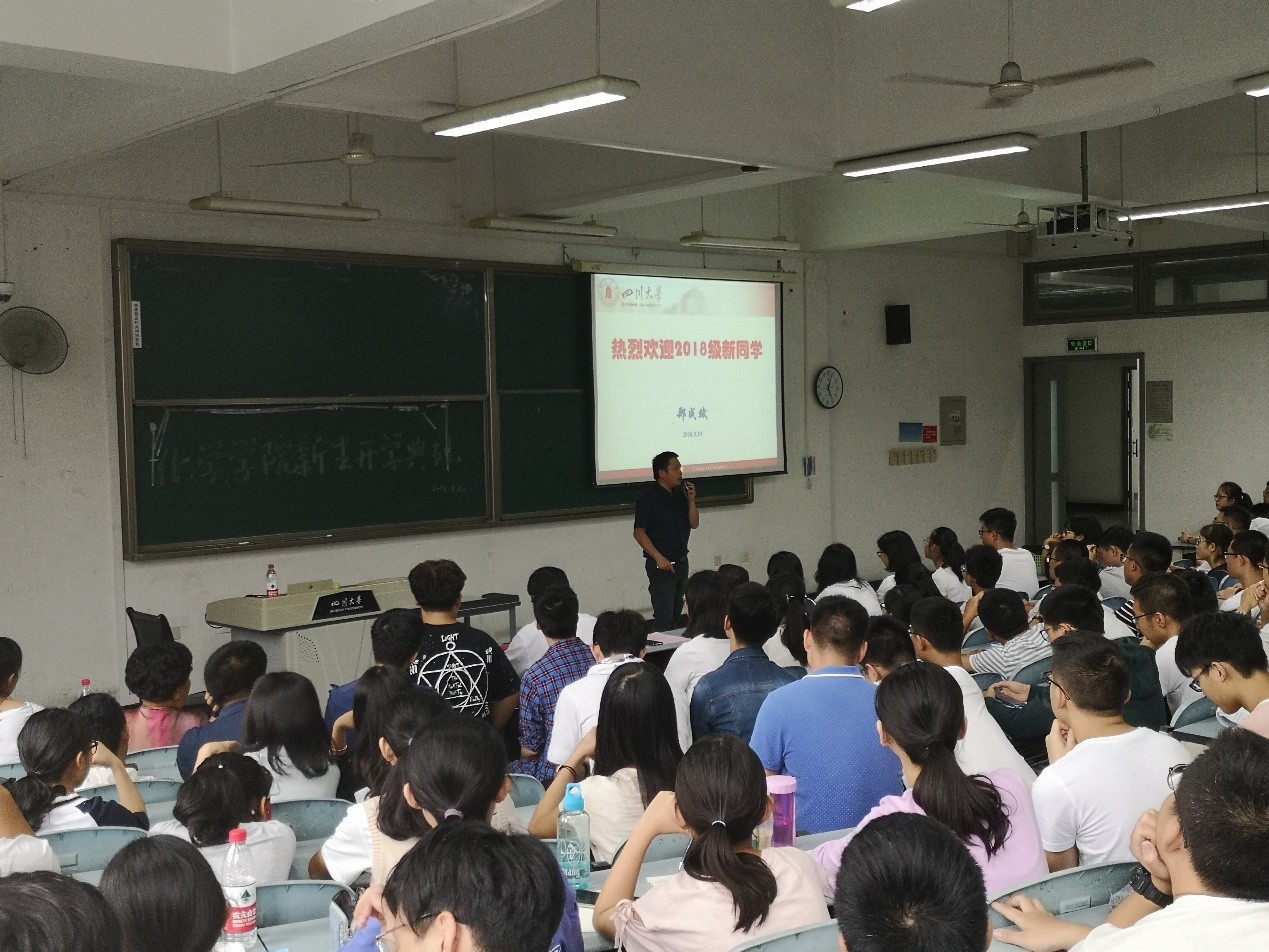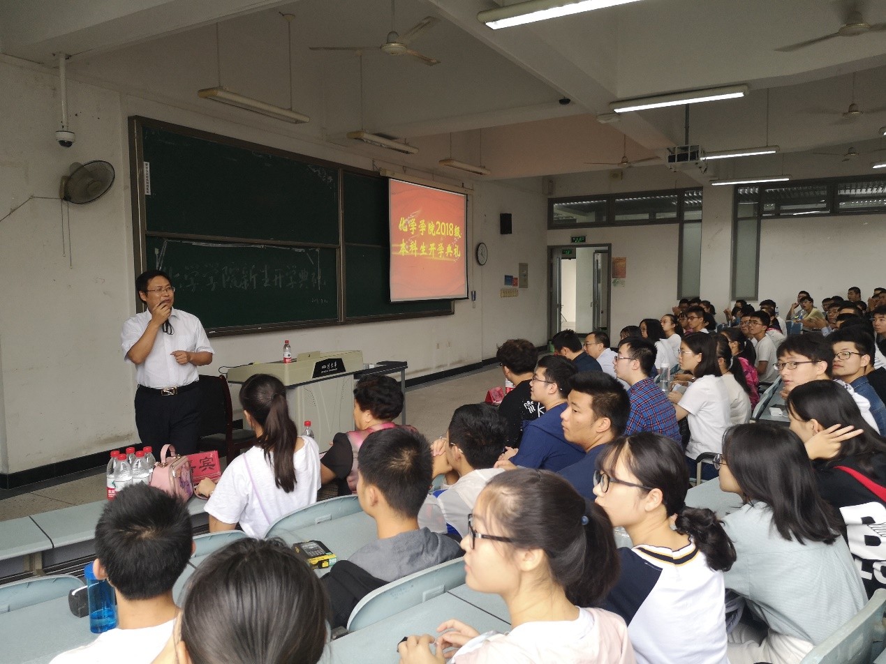 2018年9月10日下午16:00,四川大学化学学院2018级新生开学典礼在江安校区综合楼举行。游劲松院长,王智猛书记,郑成斌副院长,郭明秀教导员,2018级辅导员张若一老师出席了本次开学典礼。