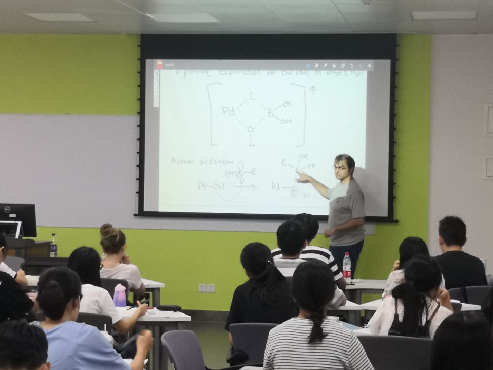2018年7月9日,美国伊利诺伊大学芝加哥分校Justin Thomas Mohr教授参加2018年四川大学“国际课程周”,在江安校区第一教学楼A座A201多媒体教室为本科生带来一门题为“Transition Metal Complexes and their Use in Organic Synthesis”的课程。在讲课过程中,Mohr教授首先感谢四川大学化学学院的邀请,并对化学学院的发展进行了高度赞扬,然后对他的研究领域——过渡金属催化的自由基反应,新型卤化方法和天然产物全合成——进行了介绍。