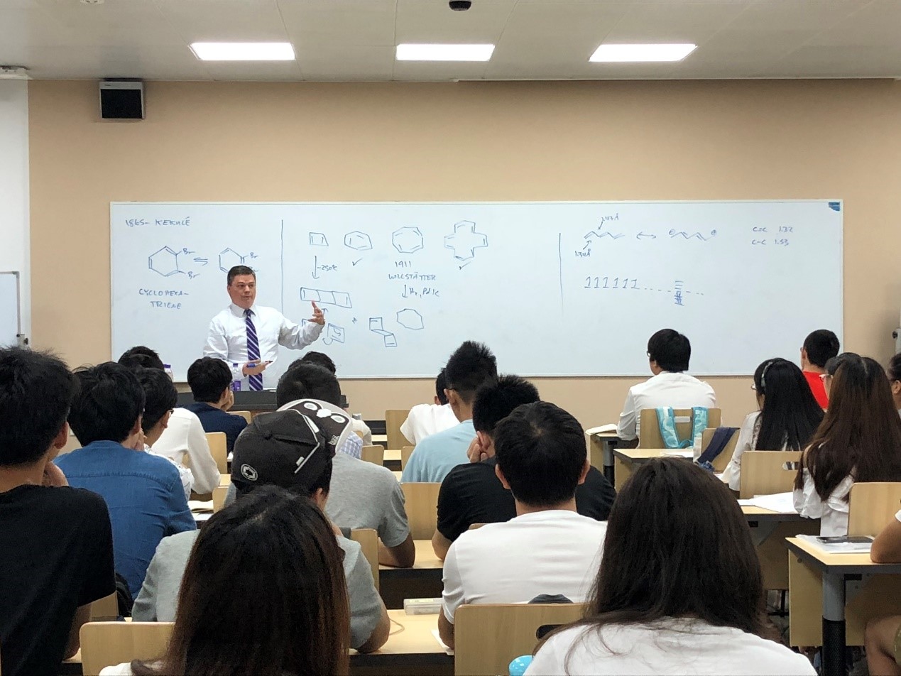 2018年7月8日,四川大学“国际课程周”盛大开幕,化学学院邀请到美国芝加哥大学化学系教授、著名有机合成化学家Scott A. Snyder教授,为本科生开设了一门“Powerful methods for C-C bond formation”的化学类专业课程。此课程在四川大学江安校区第一教学楼A座A103多媒体教室进行,选课的学生不仅有化学专业的同学,还有来自高分子材料与工程学院、临床医学院的多位同学。