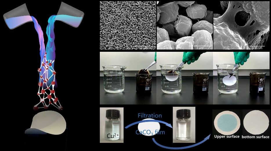 近日,化学学院环保高分子材料国家地方联合工程实验室提出将天然大分子海藻酸作为有机粘结剂,原位制备无机物含量高达95%的高韧性自支撑CaCO3膜。该柔性膜中CaCO3以方解石(calcite)形式存在,其表面被海藻酸所覆盖,并在微米CaCO3颗粒间形成大量的凝胶桥,以确保其断裂伸长率达到10%。该材料具有表面超亲水、水下超疏油及自清洁特性,可用于油水混合液分离和乳液分离;此外,由于碳酸钙可与重金属离子发生阳离子交换反应,因此通过直接过滤即可高效去除溶液中的重金属离子。