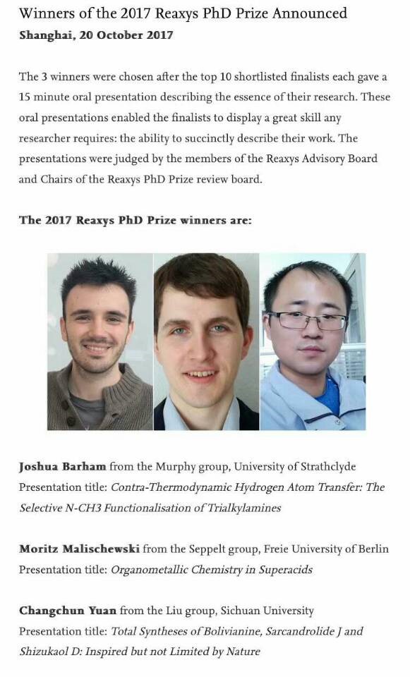 2017年10月20日,在2017 Reaxys PhD Prize研讨会上,我院2017届博士毕业生袁长春从约550名申请人中脱颖而出,被宣布为2017年度的Reaxys PhD Prize的三位获奖者之一。袁长春也是该国际奖项设立以来,首位在国内获得博士学位的获奖者。