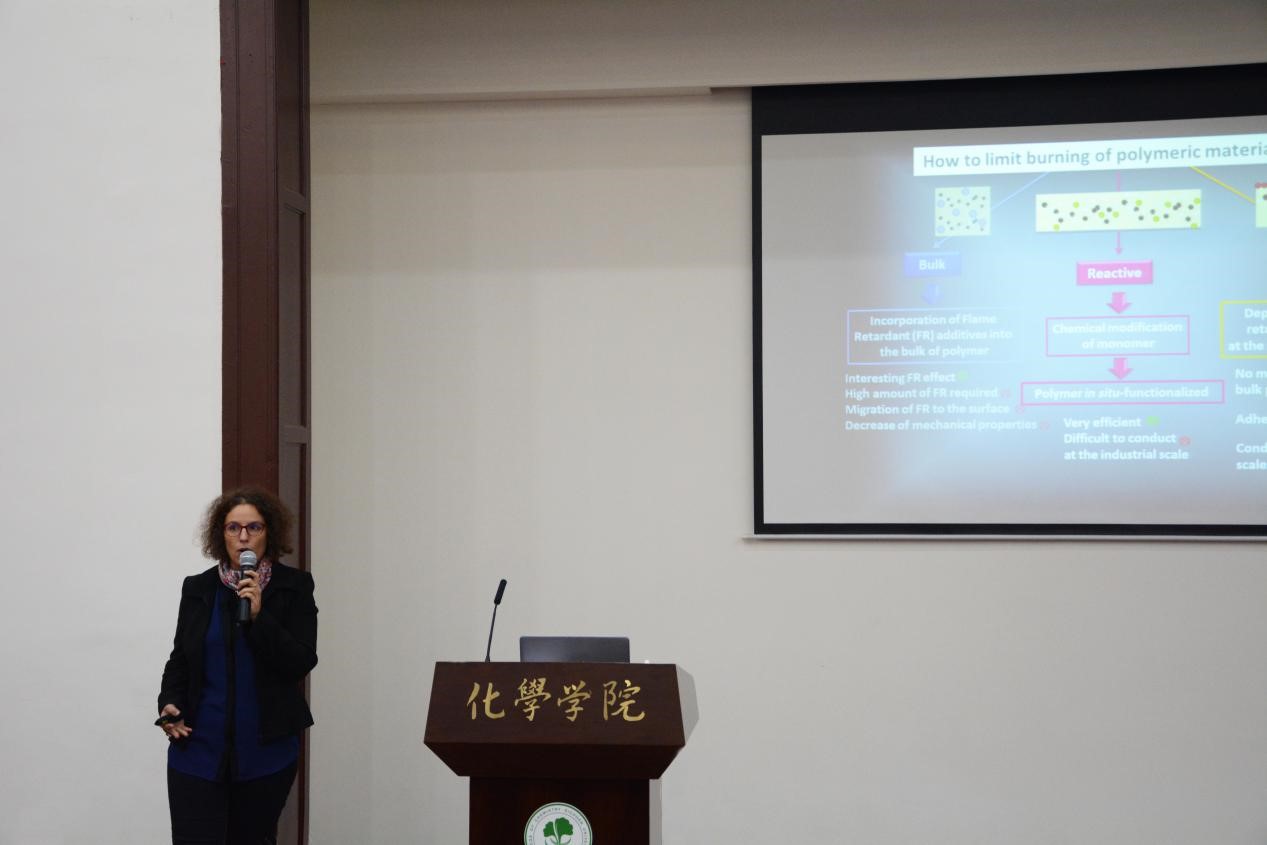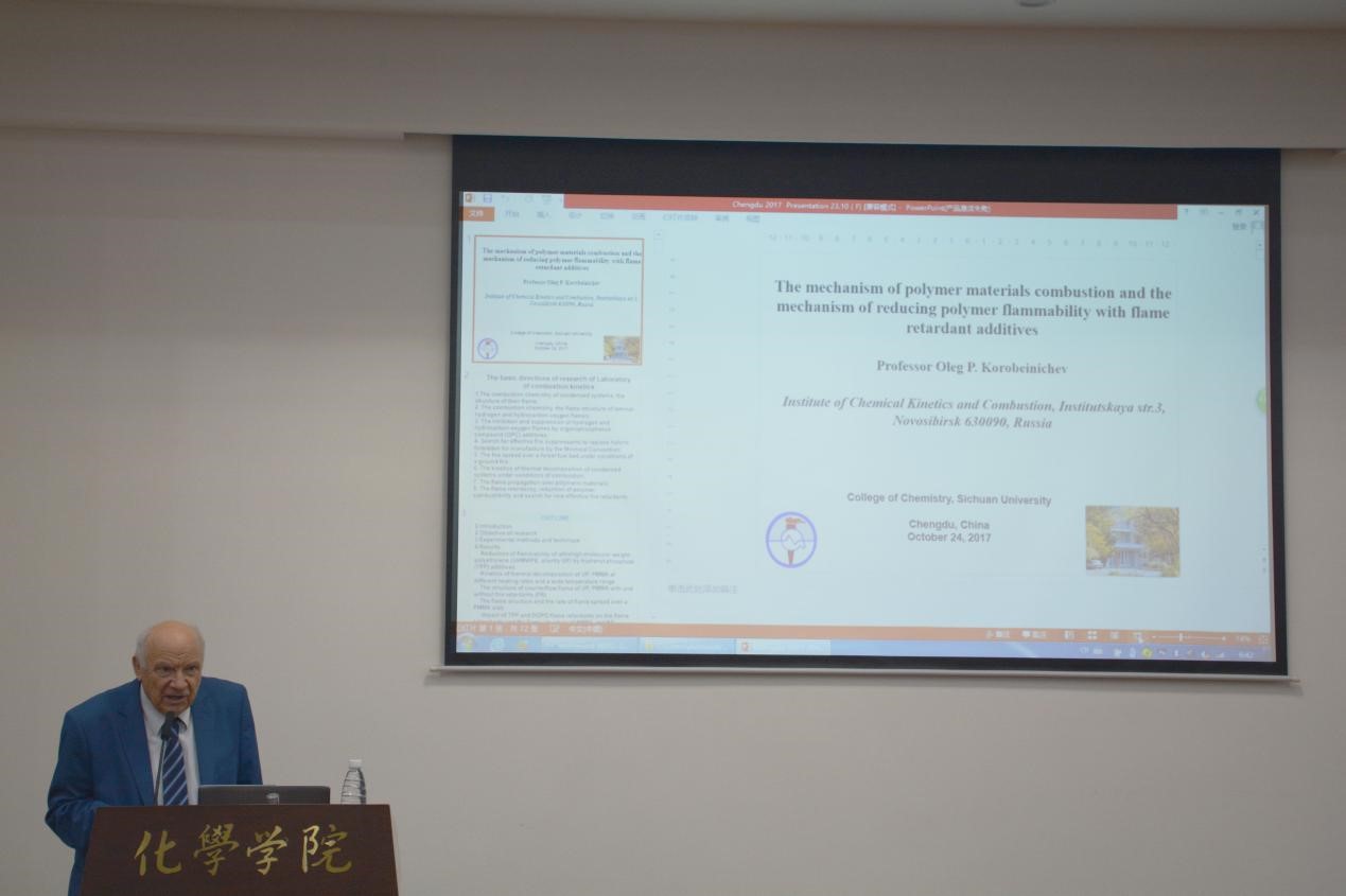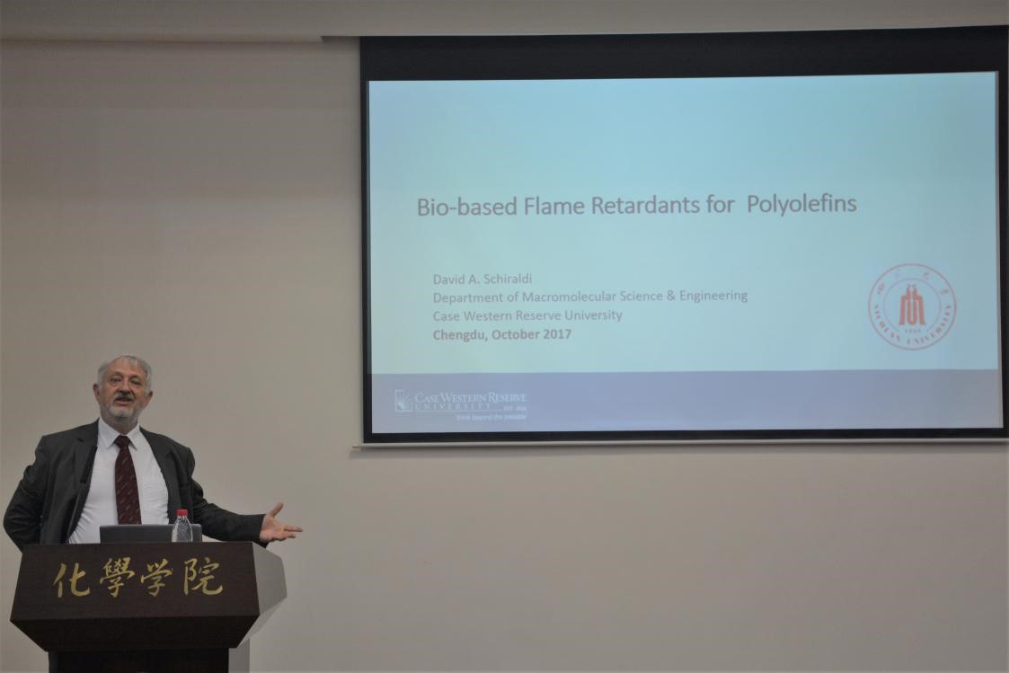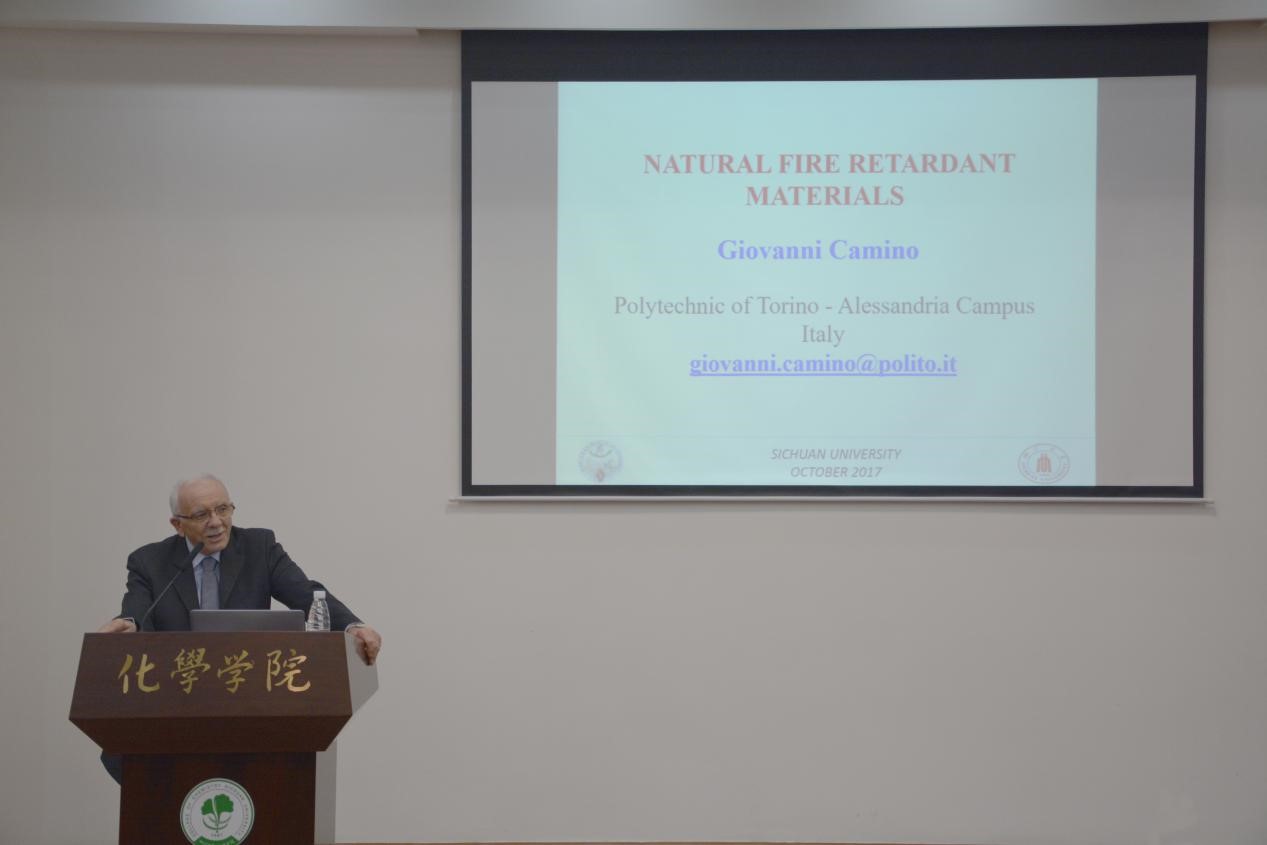 为了开阔化学学院化学试验班和高年级本科生及研究生的视野,加深对化学在国民经济发展和人民生活中发挥巨大作用的认识,提高化学专业知识水平,促进“双一流”建设对学生的培养,2017年10月19日至24日,由四川大学化学学院主办,环保型高分子材料国家地方联合工程实验室承办的“阻燃化学国际学术活动周”成功举办。活动期间,国际阻燃领域知名专家凯斯西储大学高分子工程系主任David A. Schiraldi教授、意大利都灵理工大学首席教授Giovanni Camino教授、俄罗斯科学院西伯利亚分院化学动力学与燃烧研究所OlegP.Korobeinichev教授、法国国立里尔大学Serge Bourbigot教授和Maude Jimenez教授、德国弗劳恩霍夫工作可靠性研究院(LBF)塑料事业部Manfred Doring教授等六位教授莅临化学学院,并在化学馆321报告厅做了精彩的学术报告讲座。这几位专家长期致力于聚合物阻燃材料阻燃领域的研究,在国际阻燃界久负盛名。本院的师生以及慕名而来的其他学院的老师和同学参加了此次活动。此次交流活动由环保型高分子实验室主任王玉忠院士主持,在介绍了几位教授的学术经历、学术兴趣和学术成果后,王玉忠院士代表主办单位对他们的到来表示了欢迎和感谢。