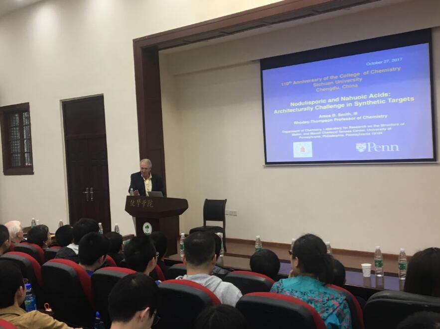 金秋十月,丹桂飘香,四川大学化学学科创建110周年系列学术活动在10月27 -28日进入新的热潮。应四川大学化学学院邀请,“超分子化学之父”的法国化学家、1987年诺贝尔化学奖获得者Jean-Marie Lehn教授,Organic Letters 主编、美国宾夕法尼亚大学教授Amos B. Smith III教授,Journal of American Chemistry Society副主编、加州理工学院Gregory C. Fu教授,Journal of Organic Chemistry主编、耶鲁大学Scott J. Miller教授,Tetrahedron: Asymmetry日本地区主编、新加坡南洋理工大学Tamio Hayashi教授等访问四川大学化学学院,在化学馆321报告厅做了5场高水平的学术报告。报告厅座无虚席,学术交流气氛极其浓厚。