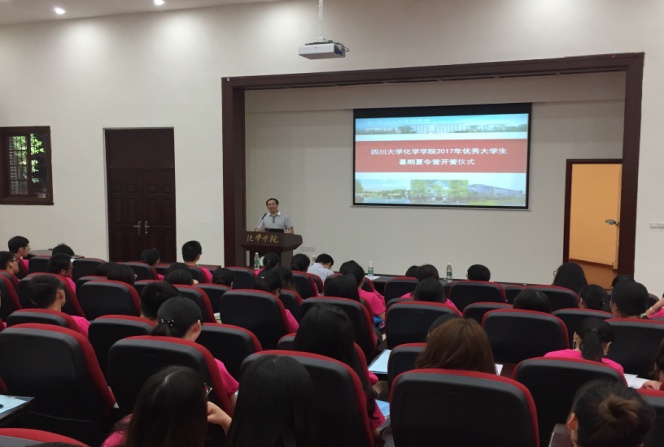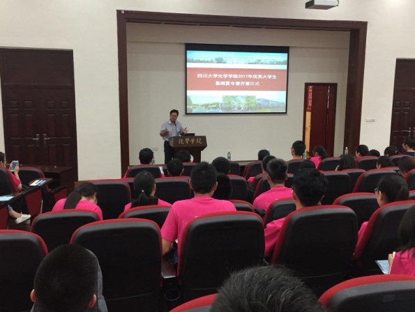 7月12日晚上,四川大学化学学院2017年优秀大学生暑期夏令营开营仪式在学院学术报告厅举行。本年度夏令营受到了同学们的广泛支持,来自四川大学、湖南大学、兰州大学、南京大学、南开大学等全国40所高校的145余名优秀本科生参加了本次活动。学院王智猛书记、游劲松院长出席了此次活动,开营仪式由教学科研科科长姜林老师主持。