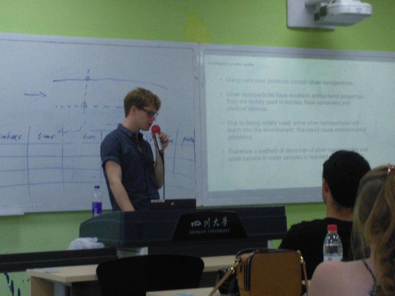 首先主持人简单介绍了我院本次水质调查活动的开展情况。随后,五个小组从污染物的危害、现状,检测方法,预防和治理等方面分别对“水中的银”,“水中的有机碳”,“水中的汞等重金属”,“水中的铬”,“水中的COD与阴阳离子”进行了详细的讲解和阐述。接着,各小组进行风采展示和欢送茶话交流会。大家纷纷上台表演节目并且发言表达自己参加本次活动的感受和感想。约克大学的学生们也都分享了此次活动的收获并且表达了临别不舍之意。最后,大家分组围坐在一起自由交流感情、惜别。