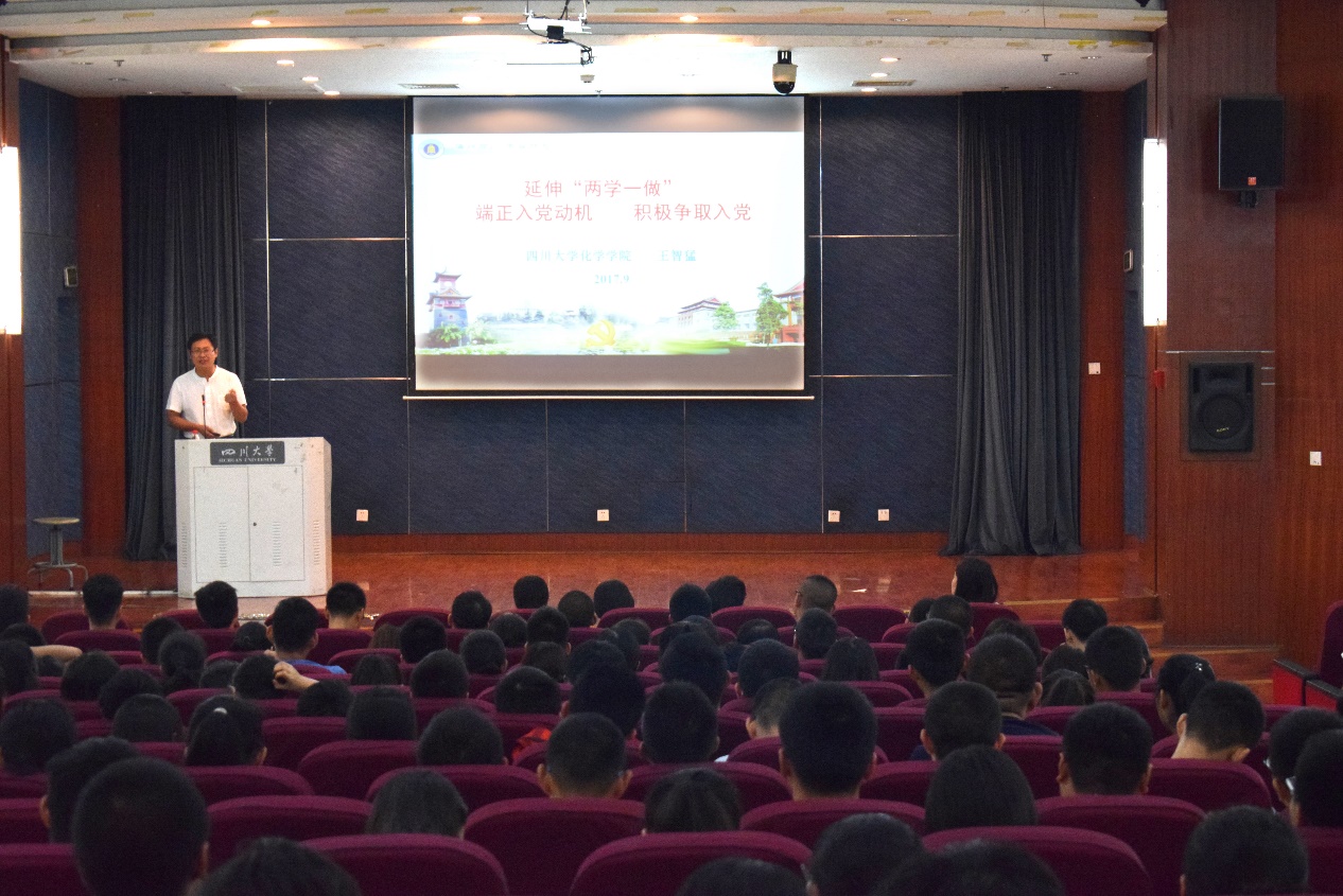2017年9月12日上午10:00,四川大学化学学院 “延伸‘两学一做’,端正入党动机,积极争取入党”知识宣讲会在江安校区二基楼报告厅成功举办。本次宣讲由化学学院党委王智猛书记主讲, 教导员郭明秀老师和2017级辅导员杨琴老师以及化学学院2017级新生参加了本次宣讲会。