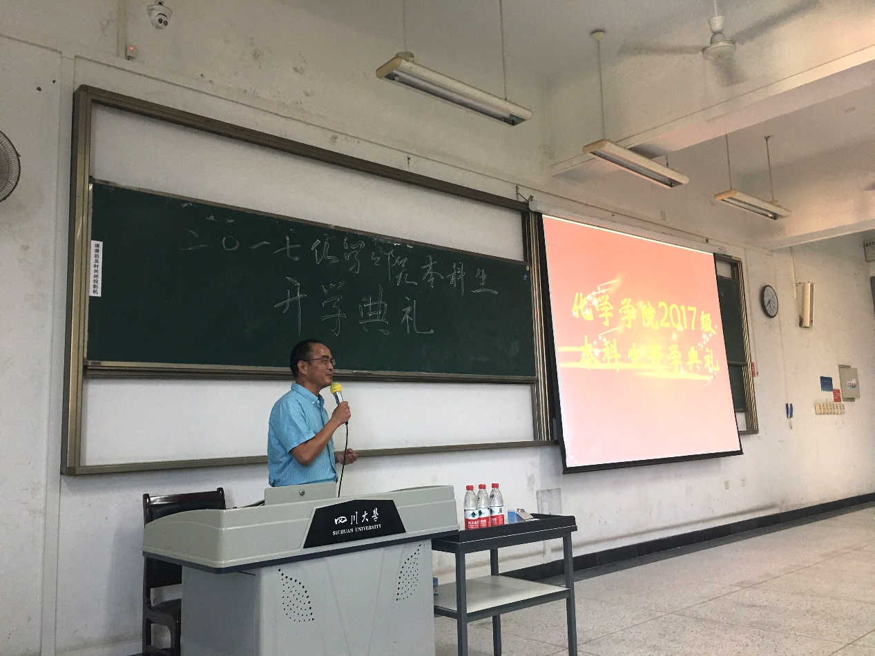 2017年9月11日下午16:00,四川大学化学学,2017级本科生开学典礼在综合楼举行。化学学院院长游劲松教授、化学学院党委书记王智猛老师、化学学院教学副院长李梦龙教授、化学学院郑成斌教授、化学学院党委副书记谢均老师,教导员郭明秀老师、2017级辅导员杨琴老师、2017级辅导员田俊老师参加了此次开学典礼。