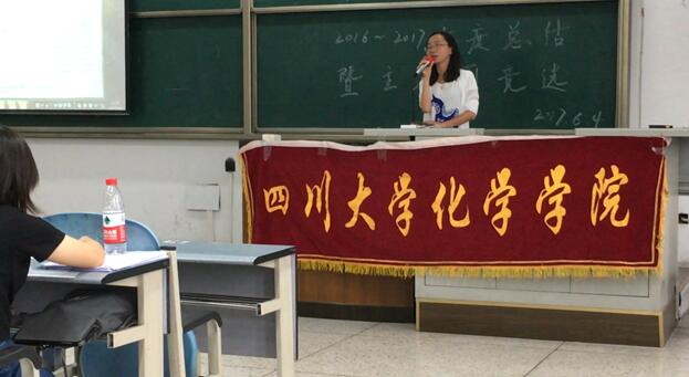 为迎接四川大学第八次党代会的胜利召开,展示学生风采,推进学院学生会工作。2017年6月4日下午14:30,化学学院学生会2016-2017年度工作总结大会于综合楼C座406顺利举行。化学学院团委书记来俏老师,院学生会主席曾泽安、2015级主席团、部长团及各部门干事参加了此次大会。