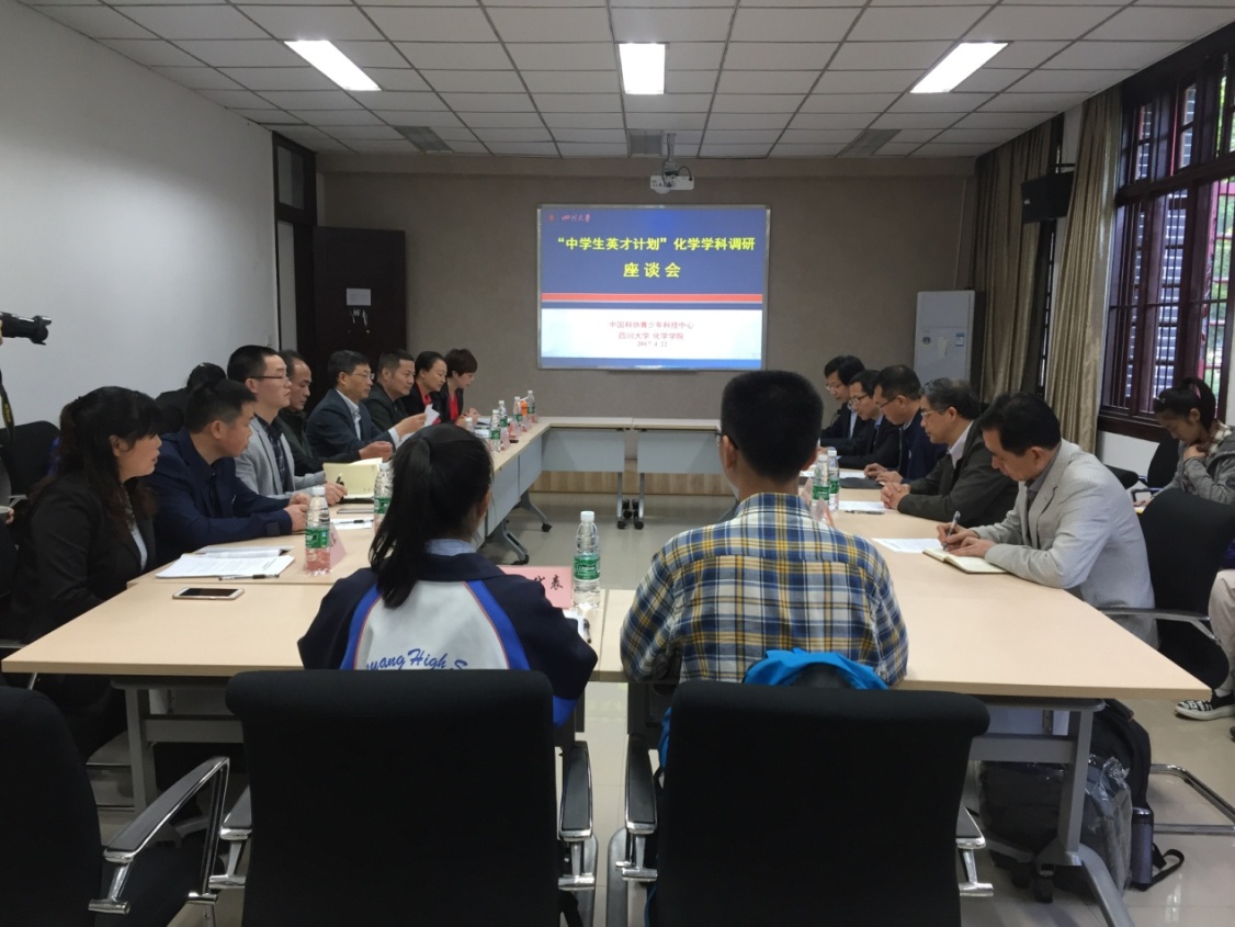 2017年4月22日上午9:00于四川大学化学馆122,“中学生英才计划”化学学科工作委员会来我校调研。中国科学技术大学校长助理、化学与材料科学学院执行院长、“中学生英才计划”化学学科工作委员会秘书长杨金龙教授,中国科协青少年科技中心院校合作处范体宇副处长,英才计划化学学科工作委员会委员:上海交通大学化学化工学院陈接胜院长、南京大学化学化工学院朱成建副院长、合肥一中特级教师李友银、四川省科技馆经戈馆长,四川省青少年科技活动中心夏虹副主任,四川省青少年科技活动中心周津伊科长,四川省参与“中学生英才计划”的中学老师和同学代表和四川大学教务处、化学学院有关领导参与了此次调研会。会议由夏虹副主任主持。