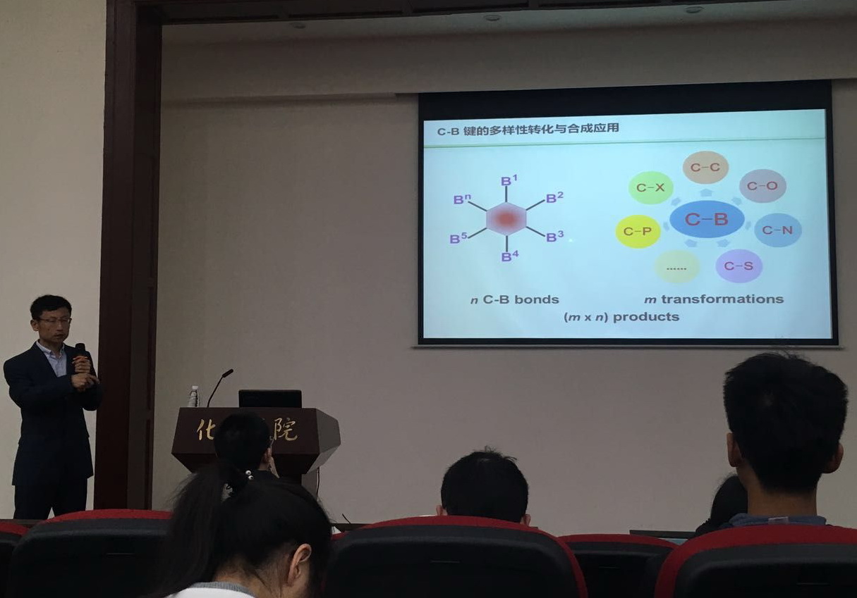 2017年4月26日上午,应四川大学化学学院邀请,西安交通大学李鹏飞教授访问四川大学并进行了学术交流。在化学馆321报告厅,李鹏飞教授详细介绍了该课题组的流动式光反应绿色合成芳基硼化合物研究工作,多硼试剂的制备及其选择性氧化偶联;随后,李教授报告了他们课题组在Tiglianes和daphnane类天然产物[5,7,6]并环的构建方面的最新进展。此次报告会由化学学院刘波教授主持,化学学院数位老师及相关专业的研究生聆听了报告。李鹏飞教授的报告内容新颖,讲解深入浅出,激起了在座老师和同学的浓厚兴趣,报告在热烈的掌声中落下帷幕。报告结束后,李鹏飞教授和现场的老师、同学们进行了多方面的交流与讨论。