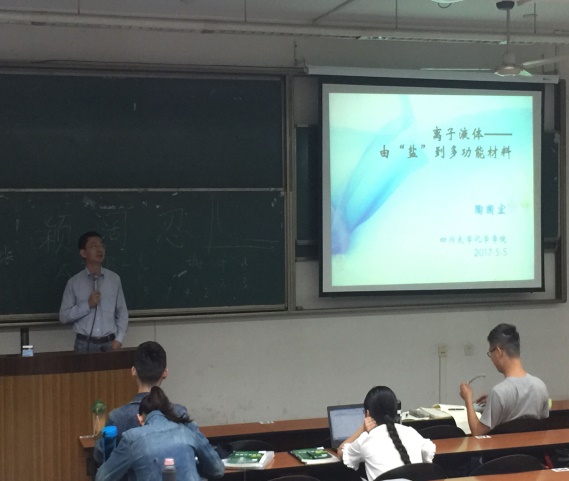 2017年5月5日晚上,四川大学化学学院化学前沿系列(九):离子液体—由“盐”到多功能材料,在江安校区第一教学楼B座307成功举办。本次主讲嘉宾为化学学院陶国宏教授,他细致的为我们讲解了离子液体的一些具体应用例子。
