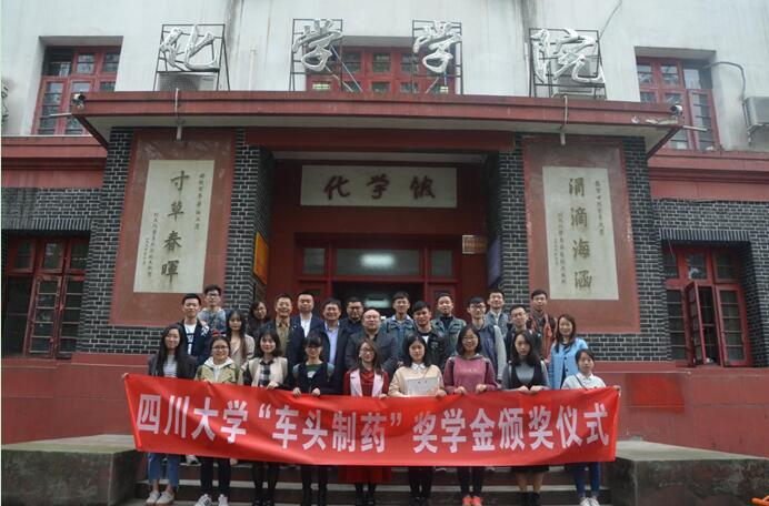 2017年4月6日上午10:00,四川大学“车头制药”奖学金颁奖仪式在四川大学化学馆122会议室隆重举行。浙江车头制药有限公司人力资源总监徐建江先生、浙江八巨药业副总经理蒋志永先生、浙江车头制药人行部部长冯勇翔先生、浙江八巨药业人行部朱沐子女士,四川大学化学学院党委书记王智猛老师、党委副书记谢均老师,华西药学院党委副书记胡晓娟老师,化工学院党委副书记李天友老师,华西药学院学生科科长章程老师,化学学院杜晓燕老师参加了本次颁奖仪式。颁奖仪式由化学学院党委副书记谢均老师主持。