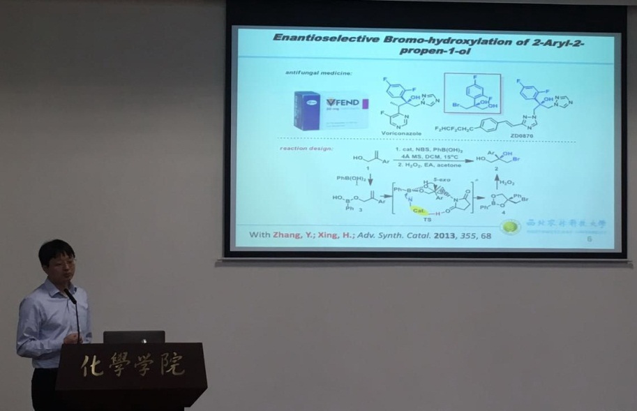 2017年4月20日上午十点半,应四川大学化学学院邀请,西北农林科技大学谢卫青教授到访四川大学并作学术交流。在化学馆321报告厅,谢卫青教授详细介绍了该课题组发展的手性阴离子相转移催化(Chiral Anion Phase-Transfer Catalysis)不对称卤化反应,该类溴化试剂催化不对称卤化反应条件温和而且手性控制优良;基于该方法学,该课题组构筑了吡咯并吲哚及呋喃并吲哚类骨架并实现了天然产物(-)-chimonantine 和 (-)-conolutinine的高效简洁合成。此次报告会由化学学院刘波教授主持,化学学院数位老师及相关专业的研究生聆听了报告。谢卫青教授的报告内容新颖,讲解深入浅出,激起了在座老师和同学的浓厚兴趣,报告在热烈的掌声中落下帷幕。报告结束后,谢卫青教授和现场的老师、同学们进行了多方面的交流与讨论。