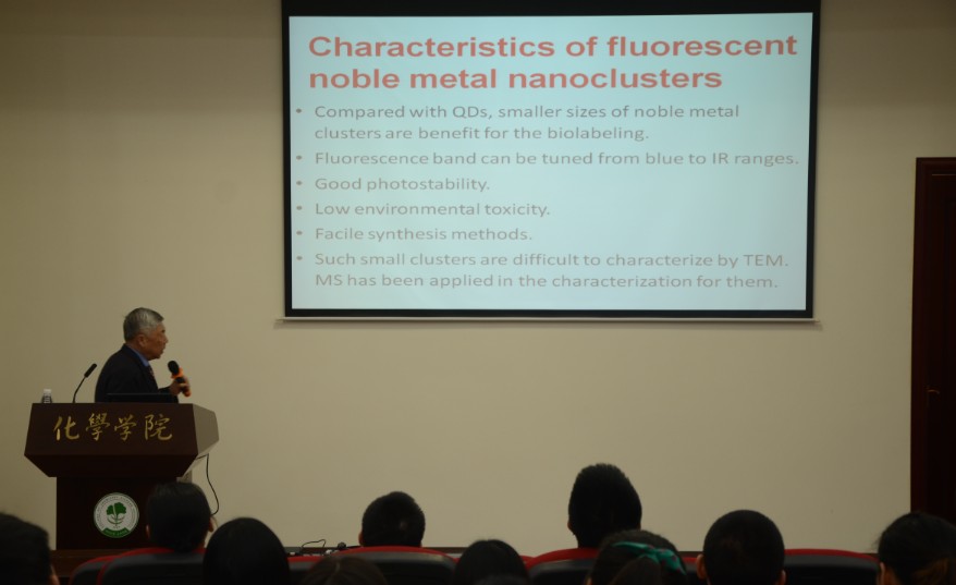 2016年10月11日下午,中国科学院长春应化所汪尔康院士应四川大学化学学院邀请在化学馆321报告厅做了题为“Fluorescent Noble Metal Nanoclusters for Analytical Application”学术报告,孙旭平、周翠松、杨千帆等老师和同学到场听取了报告,游劲松副院长主持了报告会。汪尔康院士介绍了近年来在荧光贵金属纳米晶簇在分析上的应用研究进展。报告内容新颖,讲解深入浅出,激起了在座老师和同学的浓厚兴趣。报告结束后,汪院士与学院部分师生进行了学术交流和讨论,参加学术交流的化学学院师生均感受益匪浅。