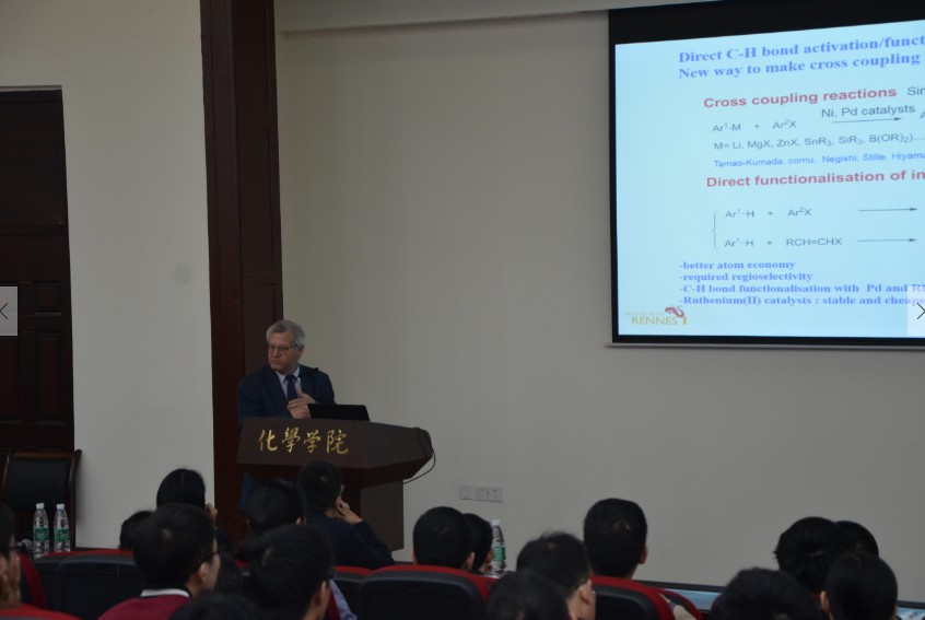 应四川大学化学学院邀请,2016年10月26日上午,法国雷恩大学Pierre H. Dixneuf教授在化学馆321报告厅做了题为“Ruthenium(II) catalysed C–H bond functionalisations”的学术报告。报告中,Dixneuf教授详细介绍了所领导的课题组近年来在钌(II)催化的C–H功能化反应领域的整体研究情况。Dixneuf教授报告内容丰富,讲解深入透彻,幽默风趣,激起了在座老师和同学的浓厚兴趣,报告在热烈的掌声中落下帷幕。报告结束后,Dixneuf教授与部分师生进行了进一步的交流和讨论。