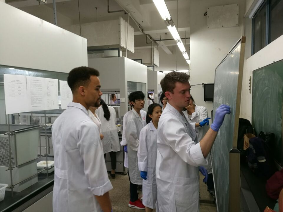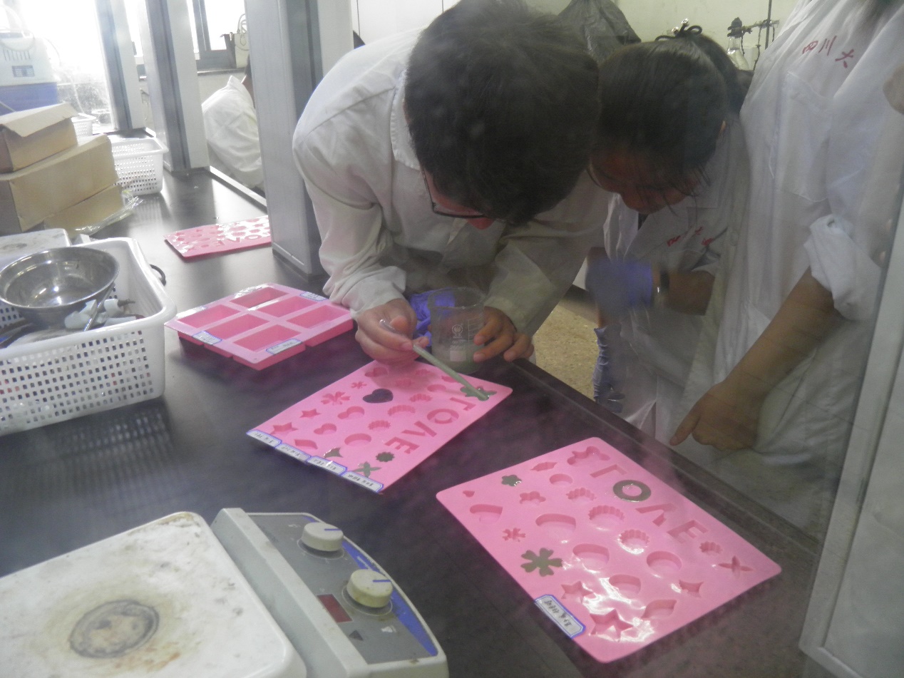 化学学院参加国际交流营的26位同学与4位英国约克大学学生于2016年7月6日和7月7日的上午在四川大学江安校区第一基础实验楼A411实验室,完成了制备手工皂以及制作叶脉书签两个创意化学实验。