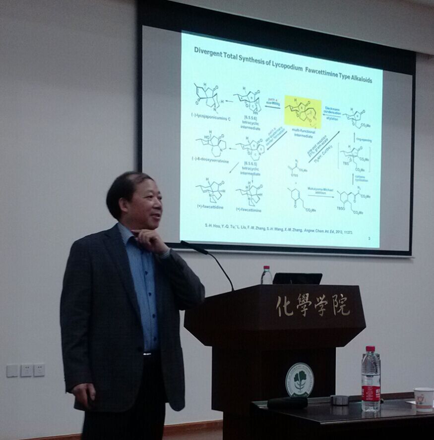 2016年4月12日上午10点,应四川大学化学学院邀请,兰州大学化学化工学院涂永强院士访问四川大学并进行了学术交流。在化学馆321报告厅,涂院士详细讲授了他所领导的课题组的特色研究:将构建手性季碳中心的Semipinacol Rearrangement和Schmidt Rearrangement与复杂天然产物全合成紧密结合。在底物的手性诱导或者手性催化剂作用下,该系列重排反应能够高效、高立体选择性地构建季碳手性中心,特别是螺环手性季碳中心。基于该方法学,涂院士课题组简捷高效地实现了一系列具有多个稠环和多个季碳中心的复杂天然产物的全合成,其中的代表性分子包括(+)-Alopecuridine、(+)-Sieboldine A、(−)-Lycojapodine A 、(-)-Lycojaponicumin C、(-)-8-Deoxyserratinine、(+)Fawcettimine、(+)Fawcettidine、Conidiogenone、Conidiogenol和Conidiogenone B等。此次学术报告会由化学学院冯小明院士主持,化学学院和华西药学院十余位教授及相关专业的研究生聆听了报告。涂永强院士的报告内容新颖,讲解深入浅出,激起了在座老师和同学的浓厚兴趣,报告在热烈的掌声中落下帷幕。报告结束后,涂永强院士和现场的老师、同学们进行了多方面的交流与讨论。