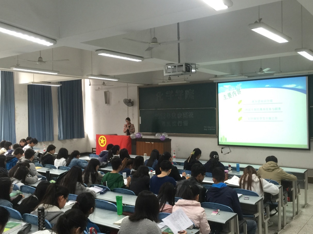2016年3月20日14点00分,由四川大学化学学院组织部举办的的2016年团校第三次行课在江安校区综合楼C107成功举行。本次课邀请到的是化学学院14级辅导员张愉老师,张愉老师以“提高团干能力,增强整体素质”为主题,分享了她对团史团章的解读并提出了对团员干部的建议和要求。
