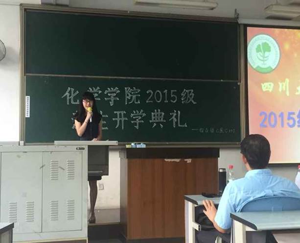 接着,2014级学生代表曾泽安祝贺新同学的到来,然后就过去一年的经历、感受,向学弟学妹们分享了学习生活的经验,也提出了一些学习生活的建议。其后,新生代表李簦芸发言,分享了进入大学的激动与期待,也代表2015级新生表明了会在接下来大学四年的学习生活中,明确目标,努力学习,向所有人展现川大学子的风采。掌声阵阵,同学们的激情与斗志开始燃烧,势必为化学学院美好的明天添上浓墨重彩的一笔。