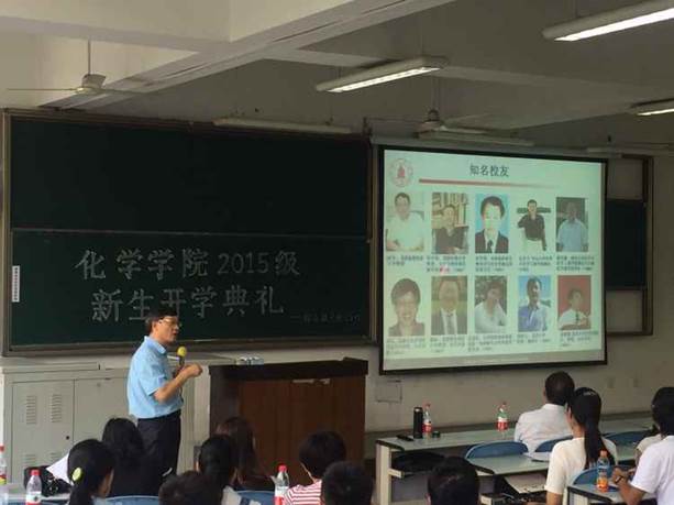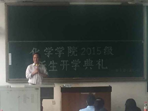 首先,王智猛书记致辞,他表达了对2015级新同学的热烈欢迎,并且对新同学们生活与学习中的诸多细节提出了建议。随后余孝其教授简要介绍了化学学院的发展历史和现况,包括现在的教学设置、科研条件、师资队伍、还有国际交流等方面的情况。接着李院长就学院的特色设置、同学们的个人培养方案向同学们给出了一些关于大学学习生活中的建议,并且表达了学院对新生的期许和关注。