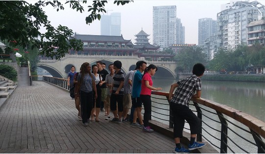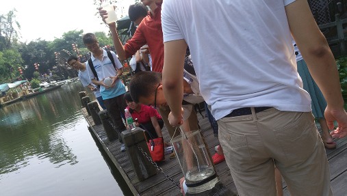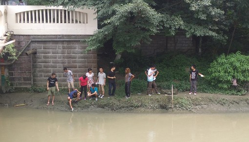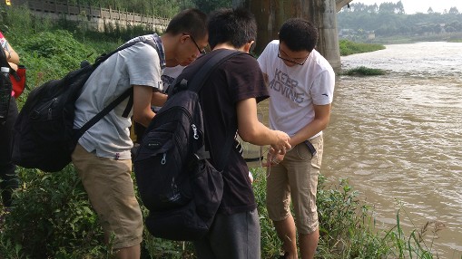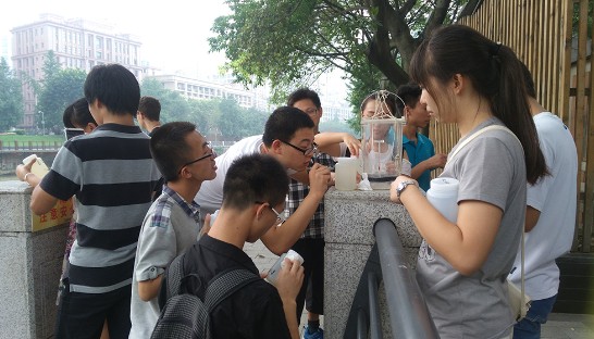 2015年7月8日,化学学院2015年水质调查活动进行了水样的采集,也表示水质调查活动正式拉开帷幕。化学学院郑成斌教授、袁茂林副教授、罗明亮副教授以及2013级辅导员杨琴老师一起带领着30名国际交流营成员在黄龙溪、府南河、沙河等6处取水地采集水样带回实验室,以进行下一步水样分析。