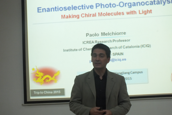 5月12日,应四川大学化学学院邀请,西班牙ICIQ研究所(Institute of Chemical Research of Catalonia)的Paolo Melchiorre教授到我院进行学术交流,并于当天上午十点在化学馆321报告厅作了题为“ Enantioselective Photo- Organocatalysis- Making Chiral Molecules with Light”的学术报告。Melchiorre教授介绍了他领导的课题组在相关领域的研究进展:1)利用催化量的手性胺与羰基化合物原位生成亚胺,该亚胺与卤代物通过形成EDA complex中间体,继而生成高光学纯度的产物;2)此外,烯醇负离子也能与卤代底物形成EDA complex中间体,继而生成高光学纯度的产物;3)光促电子转移是形成EDA complex的关键,其中亚胺和烯醇负离子作电子供体。Melchiorre教授发展的EDA complex反应体系,相对于Photo-Redox反应体系而言,不需外加金属催化剂,因此更加绿色高效。Melchiorre教授的报告内容新颖,讲解深入透彻,引起了在座广大师生的兴趣,宾主双方就多个主题做了热烈讨论。