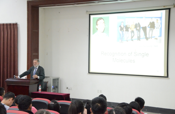 2015年04月13日,德国萨尔布吕肯大学(Saarland University)Gerhard Wenz教授应化学学院杨成教授邀请来化学学院访问,并在化学馆321作了题为“Smart Materials from Cyclodextrins”的精彩学术报告,报告由杨成教授主持,化学学院袁立华、高戈、Jason Cruma等教授及相关专业的研究生参加了此次报告。报告中,Gerhard Wenz教授就该课题组在环糊精领域的重要研究成果做了详细的讲解。报告内容丰富,Gerhard Wenz教授讲解深入浅出,激起了在座老师和同学的浓厚兴趣,报告在热烈的掌声中落下帷幕。报告结束后,Wenz教授与学院部分师生进行了激烈的讨论。