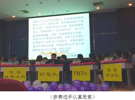 二十位参赛选手由赛前抽签被随机分为4组——化学城管大队、彩笔队、TNT队和炼金术士队。化学学院党委副书记谢均老师致开幕辞,对初赛、复赛进行了简单的回顾后,决赛进入必答环节。必答题从生活和实验中一些简单的化学现象出发,探索其背后的原理,每组5题依次作答,且每组有一次求助现场观众的机会。4支队伍展开了激烈的角逐。抢答环节题目难度有所上升,如果参赛选手不能在规定的时间内抢答成功,现场的观众就有机会回答问题并获得丰厚的奖品。在抢答环节后炼金术士队遗憾离场。