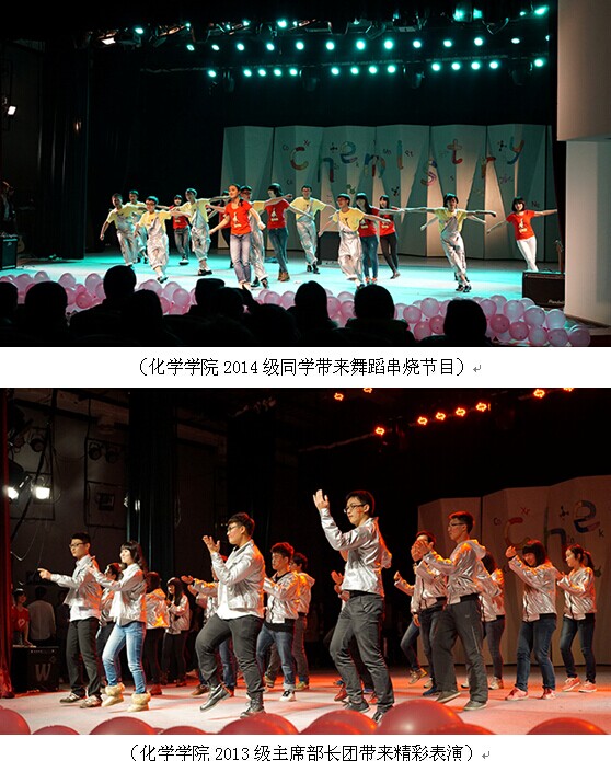 一段充满化学魅力的视频总结了团委学生会过去一年的工作,更是展示了入学半年以来2014级同学们的成长。在同学们的掌声中迎新晚会正式开始。今年的迎新晚会有友情加盟的四川大学校合唱团带来的歌曲《思念》,有轻松幽默的情景剧《节目怎么办》,有令人捧腹的古装剧《荆轲刺秦王》,有激情四射的乐队倾情演唱的《恋爱ing》,有漂亮的研究生学姐带来的《夜上海》……还有老师秀《最美》和部长秀《冬天里的小苹果》更是点燃了现场的火爆气氛,由公共管理学院的同学们带来的爵士舞更是得到了大家的一致好评。经过前期充分的准备,化学学院团委学生会在晚会上正式推出了官方微信平台。最让同学们期待的抽奖环节上,在全场观众的见证下通过微信墙的滚动抽出31份大礼都送到了同学们手中。