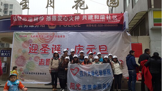 冬日的寒冷抵不住心中的热情,为了使小区居民密切交流,增进感情,双流青少年工作协会联合四川大学化学学院“阳光”青年志愿者服务队于2014年12月14日上午在成都双流西航港星月社区开展了“迎圣诞•庆元旦志愿者风采展示”活动。