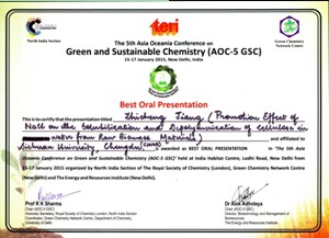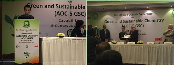 第五届亚洲大洋洲绿色与可持续发展化学大会(The 5th Asia-Oceania Conference on Green and Sustainable Chemistry)于2015年1月15-17日在印度首都新德里召开。本次会议参会人数约250人,其中邀请到了包括Prof. Paul T. Anastas (Yale University, USA), Prof. James Clark (University of York, UK), Dr. John C. Warner (Warner Babcock Institute for Green Chemistry, USA), Dr. David Constable (ACS-GSI, USA)等几十位国际绿色化学领域知名科学家,以及来自11个国家和地区的代表。四川大学化学学院2013级硕士研究生蒋智成(导师:胡常伟老师)在本次会议上做了题为“Promotion Effect of NaCl on the Solubilization and Depolymerization of Cellulose in Water from Raw Biomass Materials”的口头报告,该报告受到了大会专家的好评,并获得大会颁发的“最佳口头报告奖”(Best Oral Presentation,大会选定了共3名)。