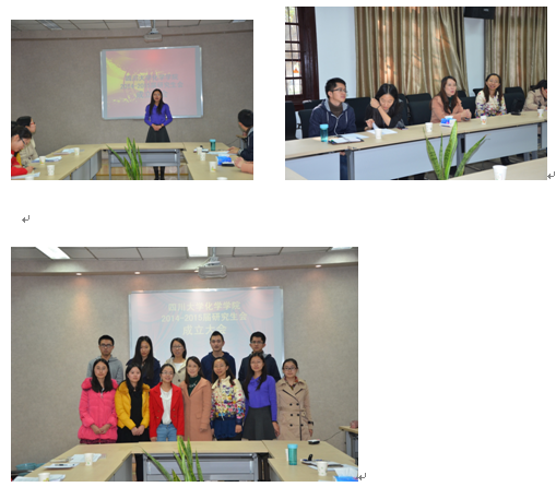 2014年11月11日下午,化学学院2014-2015学年研究生会成立大会在化学馆122会议室举行。化学学院党委副书记谢均老师,分团委书记来俏老师,新一届研究生会主席团、各部门部长及部分干事参加了成立大会。