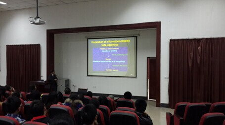 应四川大学化学学院邀请,香港理工大学黄国贤教授于2014年10月17日访问四川大学并进行学术交流。在化学馆321报告厅,黄忆宁教授做了题为“Biosensing with novel fluorescent agents”的学术报告。他介绍了该课题组近几年利用各种新颖的荧光剂应用在生物传感器方面的最新研究进展。余孝其院长主持了报告会,李坤等研究人员和学生到场听取了报告。黄教授报告内容新颖,讲解深入浅出,激起了在座老师和同学的浓厚兴趣。报告结束后,黄教授与学院部分师生进行了交流和讨论。