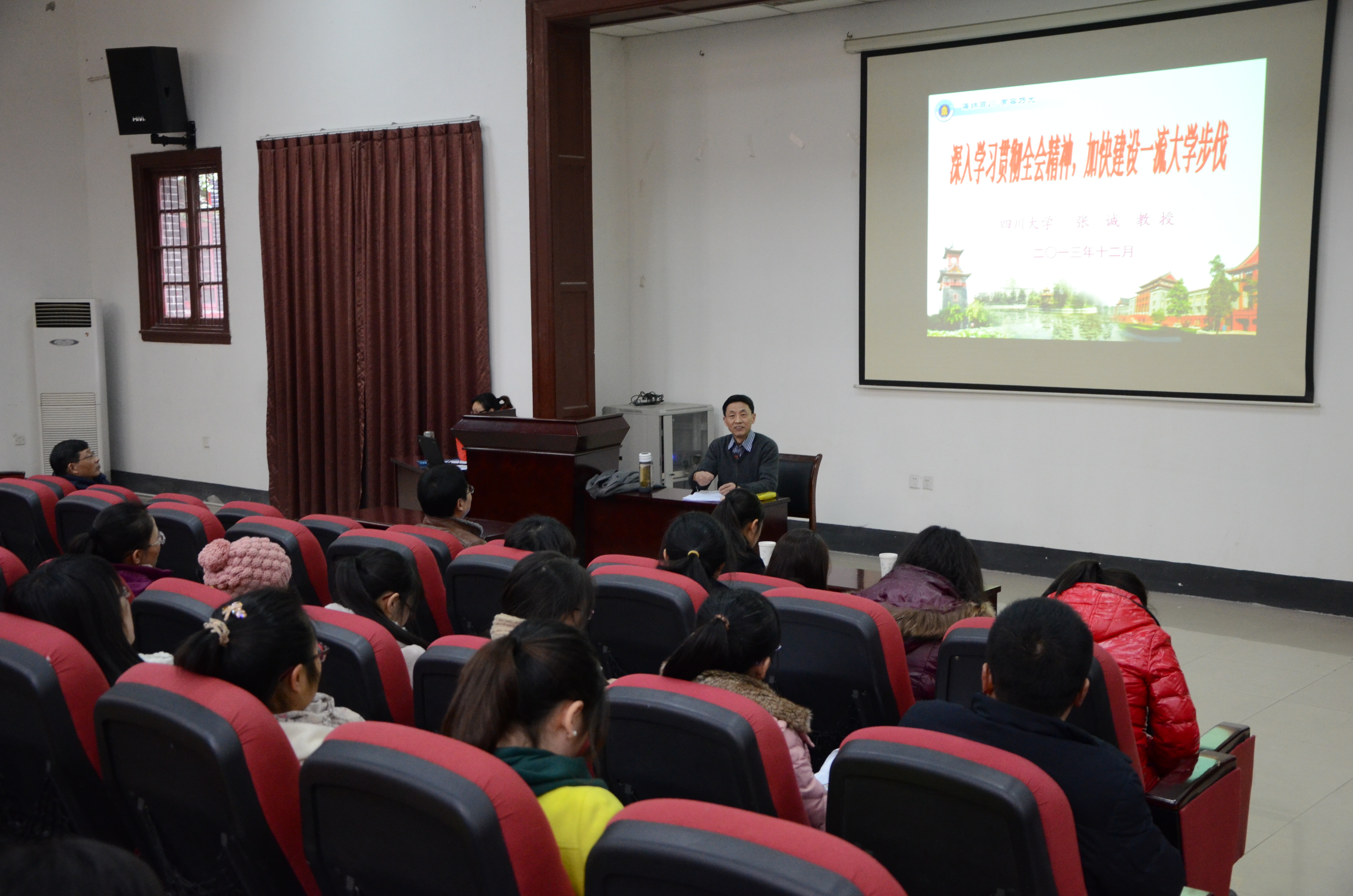 张诚教授以“认真学习贯彻全会精神,加快一流大学建设步伐”为主题,从“全会特别重大的意义、深化改革的总目标、路线图和重大举措、联系实际贯彻全会精神的思考”三个方面,系统宣讲了党的十八届三中全会的主要精神。