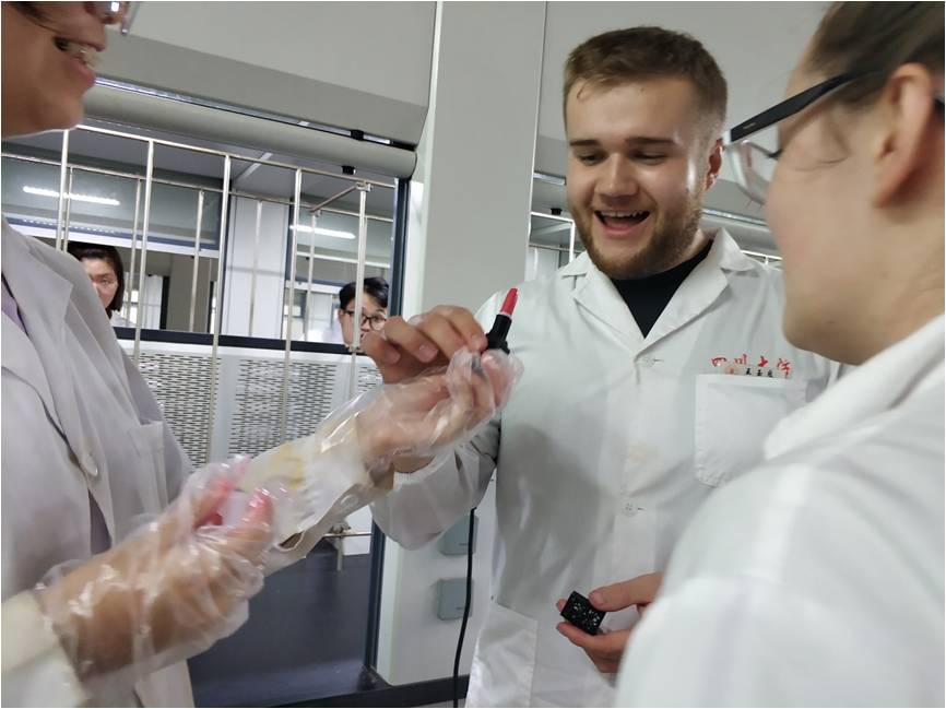 2019年7月4日、5日的下午2:30,由创意化学社主办的国际课程周之趣味实验活动在四川大学江安校区一基楼A412成功举办。本次活动由创意化学社组织举办,实验中心白蓝老师和刘媛老师指导。参与活动的还有本次国际交流营的6名留学生和化学学院2017级本科部分同学。