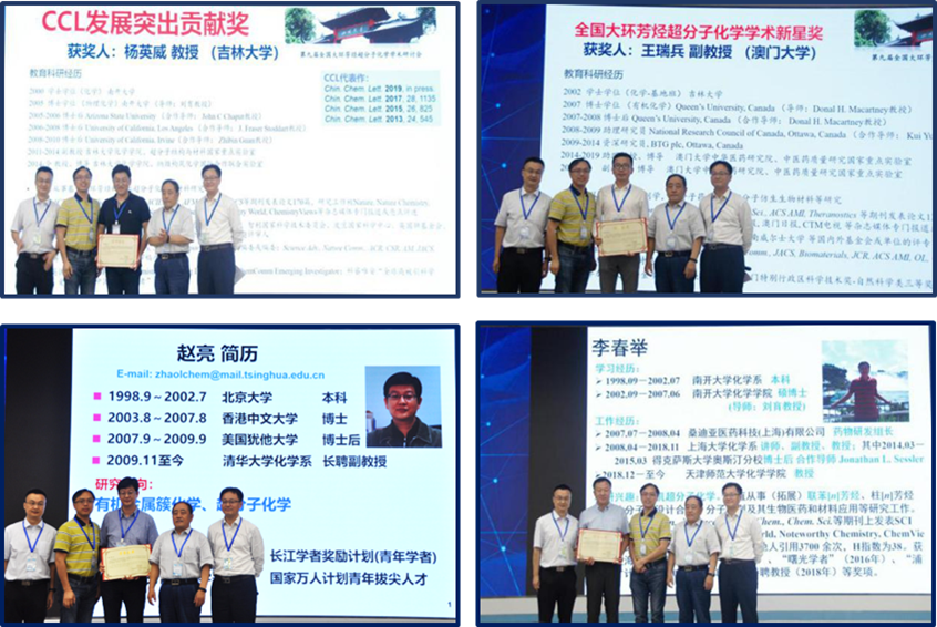 会议宣布了CCL突出贡献奖及全国大环芳烃超分子化学学术新人奖。吉林大学的杨英威教授获得CCL突出贡献奖,澳门大学的王瑞兵副教授、天津师范大学的李春举教授和清华大学的赵亮教授获得全国大环芳烃超分子化学学术新人奖,并分别做了获奖报告。