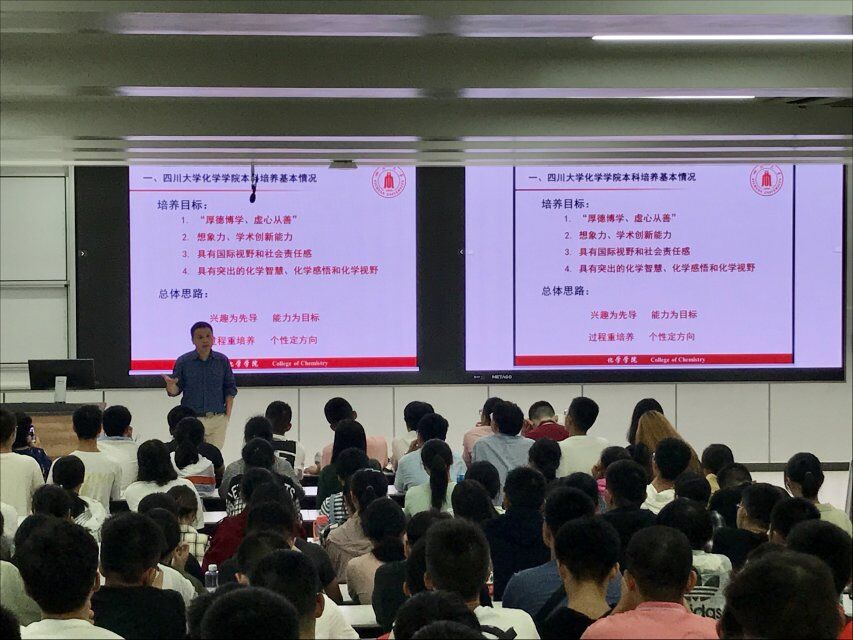 学院党委书记王智猛介绍了四川大学和化学学院的基本情况,包括办学历史、学院专业与师资力量、教学科研、学生活动、优秀学子、学院荣誉等等,鼓励大家好好利用学院这个优秀平台,为化学事业的发展做出贡献。