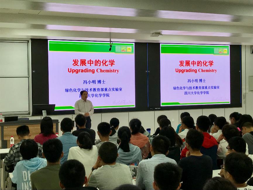 2019年9月5日上午,由中国科学院院士、四川大学化学学院教授、博士生导师冯小明教授主讲的化学专业教育讲座“发展中的化学”在四川大学江安校区举行。化学学院党委副书记谢均、教导员郭明秀、2019级辅导员来俏和学院全体2019级本科新生一起聆听了这场精彩的讲座。