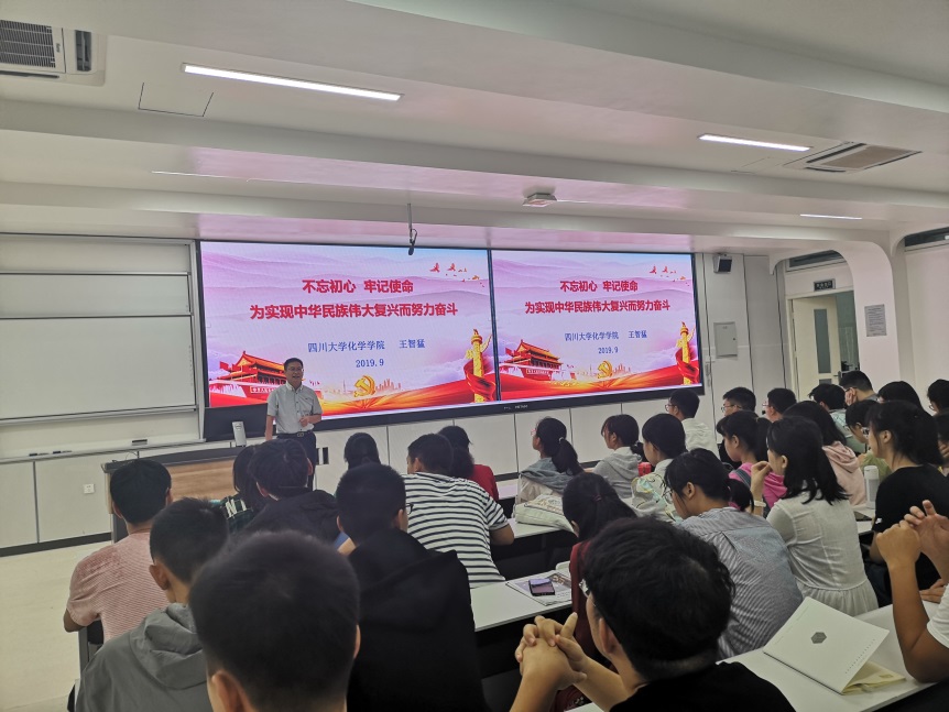 9月4日上午,化学学院党委书记王智猛为学院2019级本科新生带来了一场主题为“不忘初心,牢记使命,为实现中华民族伟大复兴而努力奋斗”的讲座。