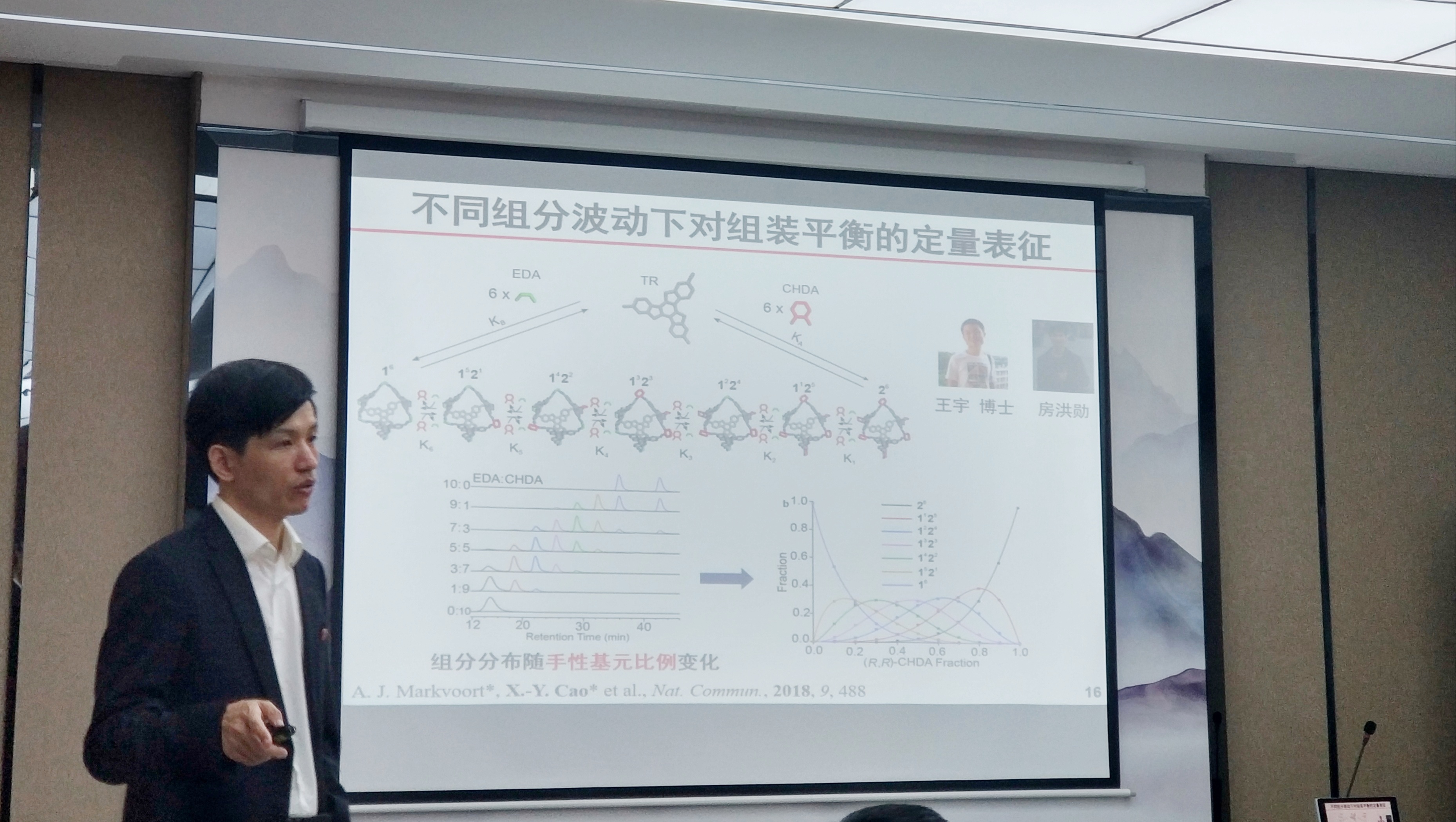 在报告中,首先曹晓宇教授介绍了什么是自组装,随后详细的介绍了他们课题组如何借鉴自然和数学中的面方向性多面体概念,发展了以三聚茚、氮杂三聚茚、四苯乙烯等为基元的一系列面方向性分子多面体组装体系,将组装基元的二维手性传递至分子多面体的三维手性,是一类全新的分子多面体手性形式。曹晓宇教授课题组综合利用HPLC、MS、CD、NMR等分离表征技术,监测组装过程动力学,揭示了组装过程中手性产生,传递,放大过程和机理。进而阐述了“物质如何变得复杂”,以及如何通过化学的方法去实现这一重要而有趣的课题,介绍了该课题研究的重要科学意义。整场报告内容丰富,曹晓宇教授讲解思路清晰,由浅入深,形象生动地为我们分享了他的科研成果和科研心得,给予同学们极大的鼓舞和激励。在座的师生全神贯注、兴趣盎然。在随后的自由提问环节,在座师生与曹晓宇教授进行了深入地讨论交流,大家都表示受益匪浅。报告在全场师生热烈的掌声中落下了帷幕。