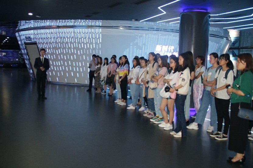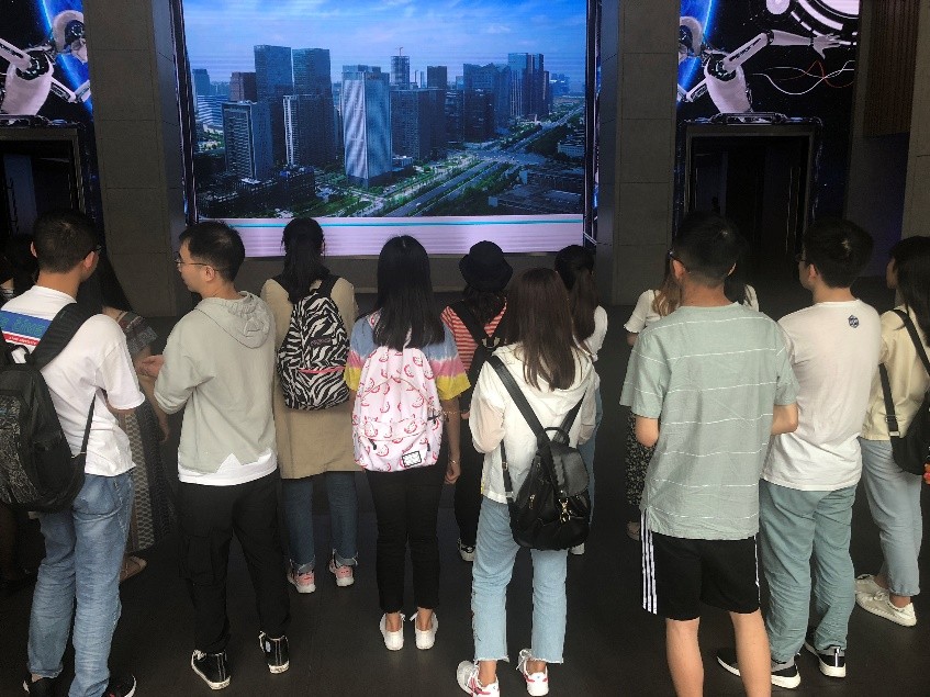 第一站是成都新经济活力区双创服务平台展厅。在专业讲解员的带领下,推开一扇镌刻着130多年前成都老地图的大门,成都新经济发展的亮点便一一呈现在同学们的眼前。“人、城、产”三大主题厅的分割布局,充分展现了成都重才爱才以及城市规划和新经济发展的城市活力。近几年来新经济园区在通信、医疗、材料、人工智能等方面科技创新成果丰硕,通过生动有趣的实物展示,我院师生参与其中互动体验,充分感受到了高新区的新经济脉动。