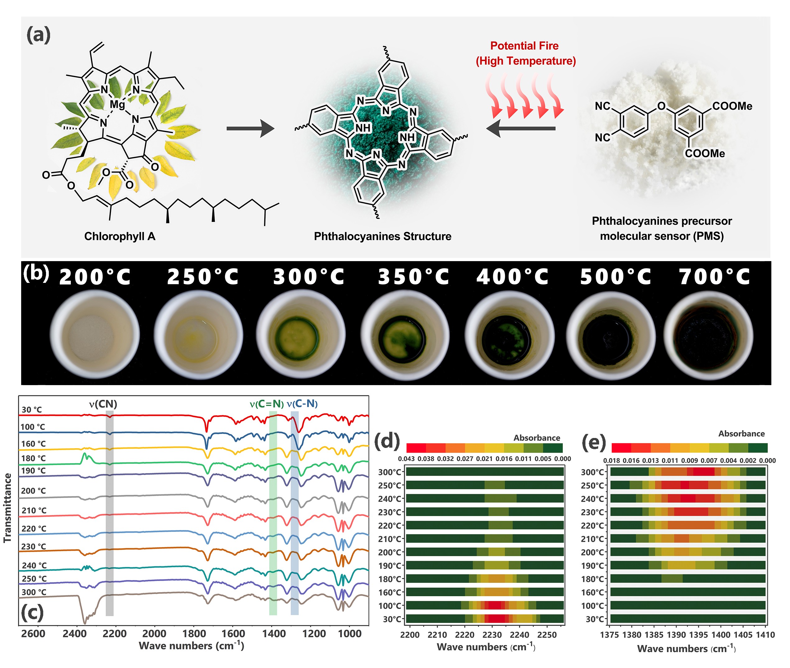 图2(a)分子传感器的设计灵感,(b)邻苯二腈高温变色过程