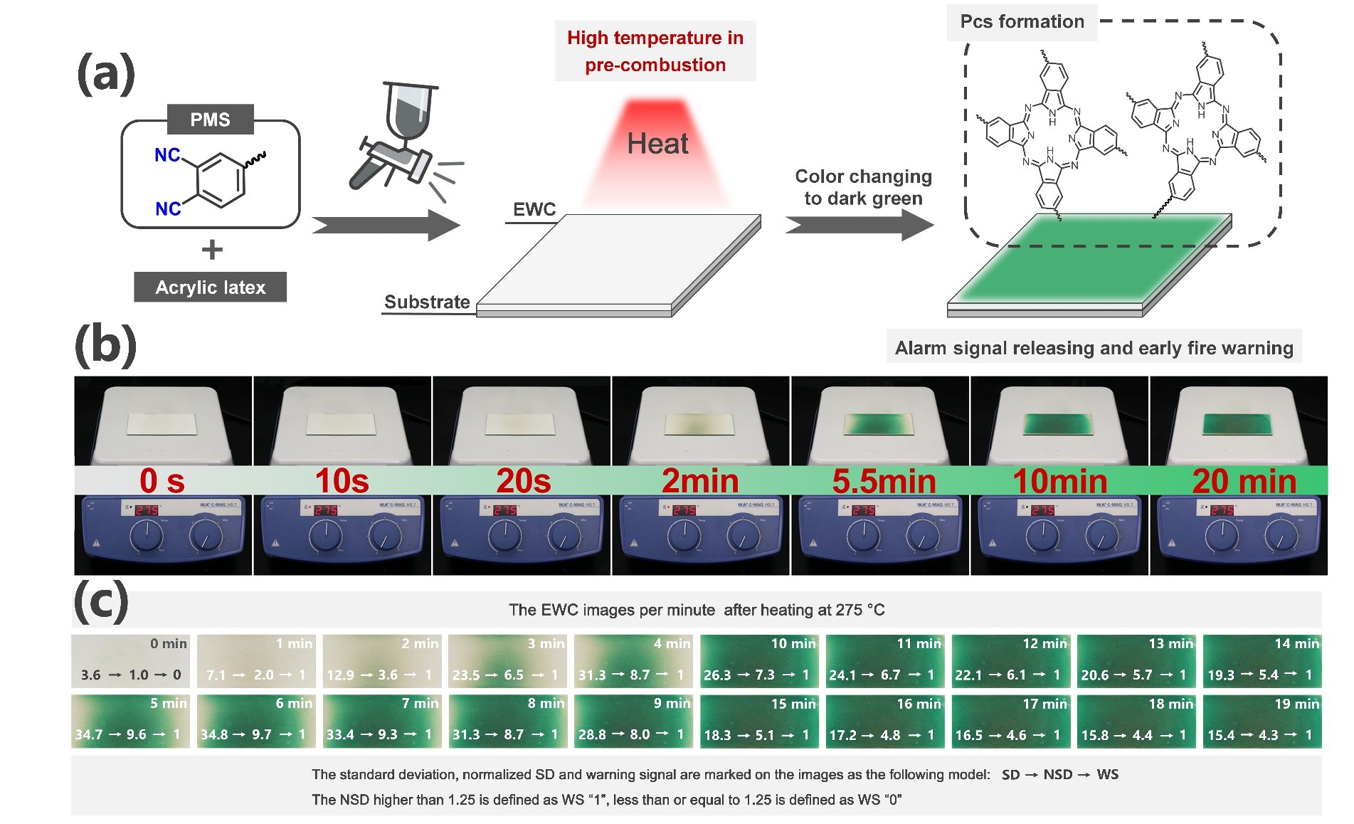 图3(a)火灾预警器件的制备示意图,(b)潜在火灾高温模拟实验