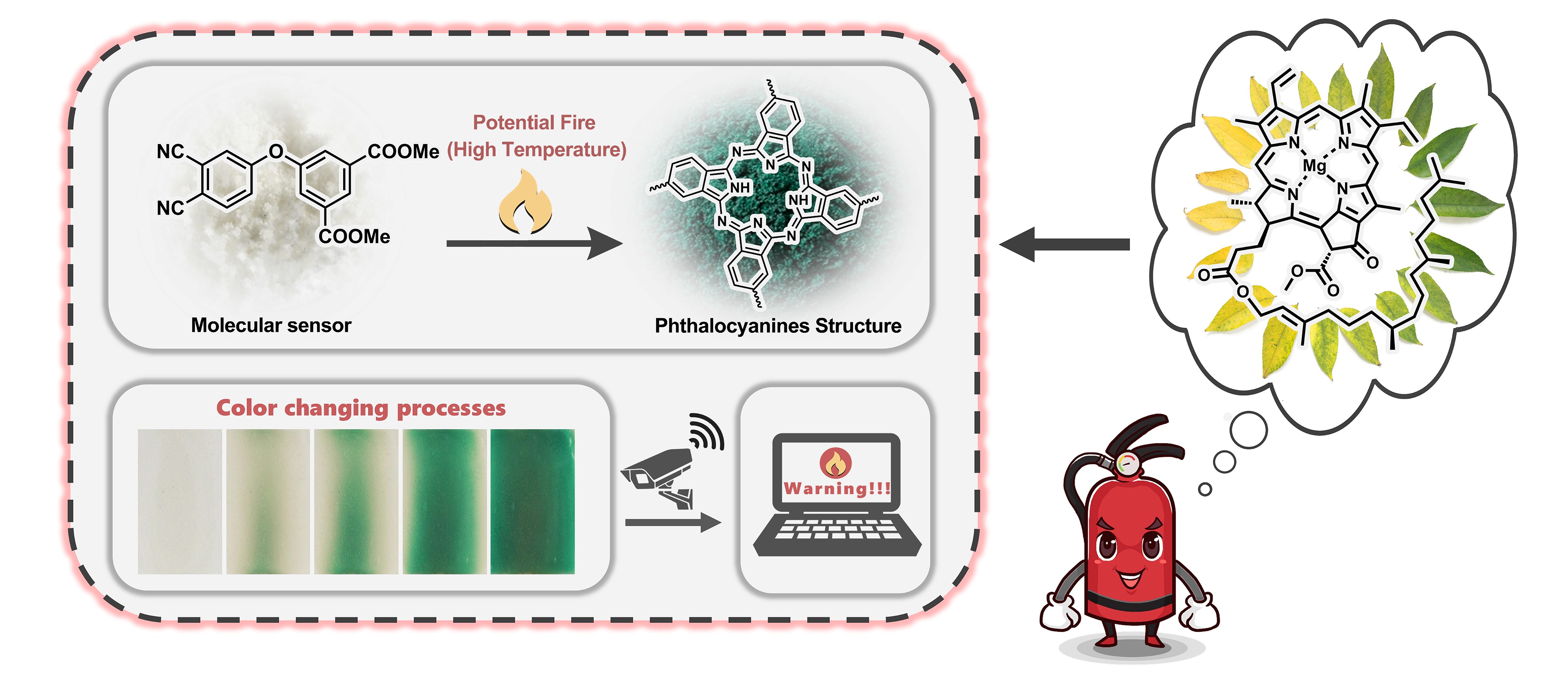 四川大学王玉忠教授团队受到自然界中的植物叶绿素的代谢和分子结构启发,设计制备出可在潜在火灾的高温下发生智能变色的分子传感器(Precursor Molecular Sensor,PMS),并将其与图像识别算法相结合,发展了一种防火于未燃的极早期潜在火灾和早期火灾的探测预警技术,可实现20s内潜在火灾高温响应(275°C)和3s内明火预警(预警技术示意图如图1所示)。