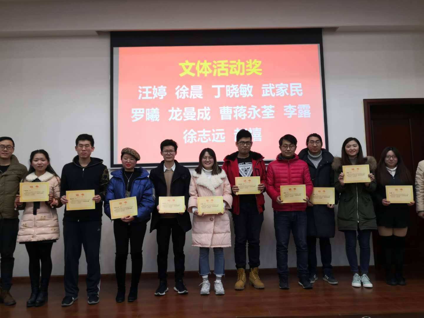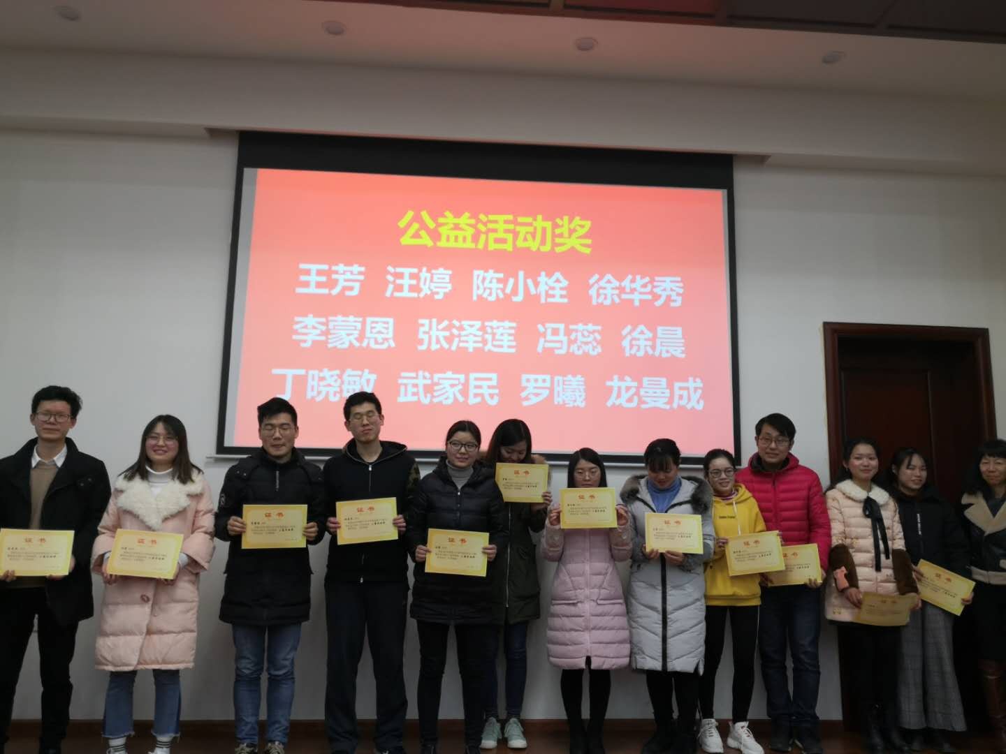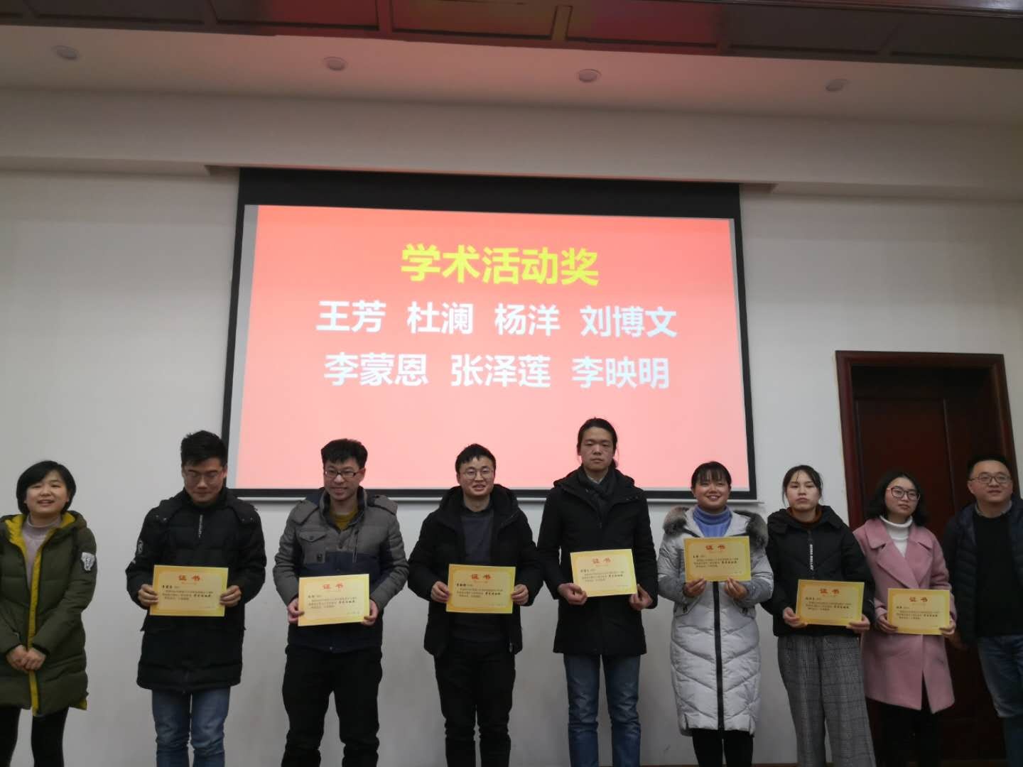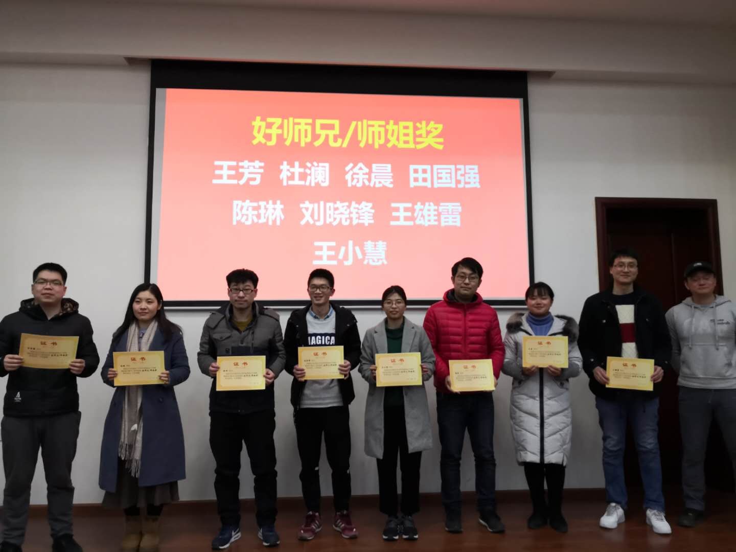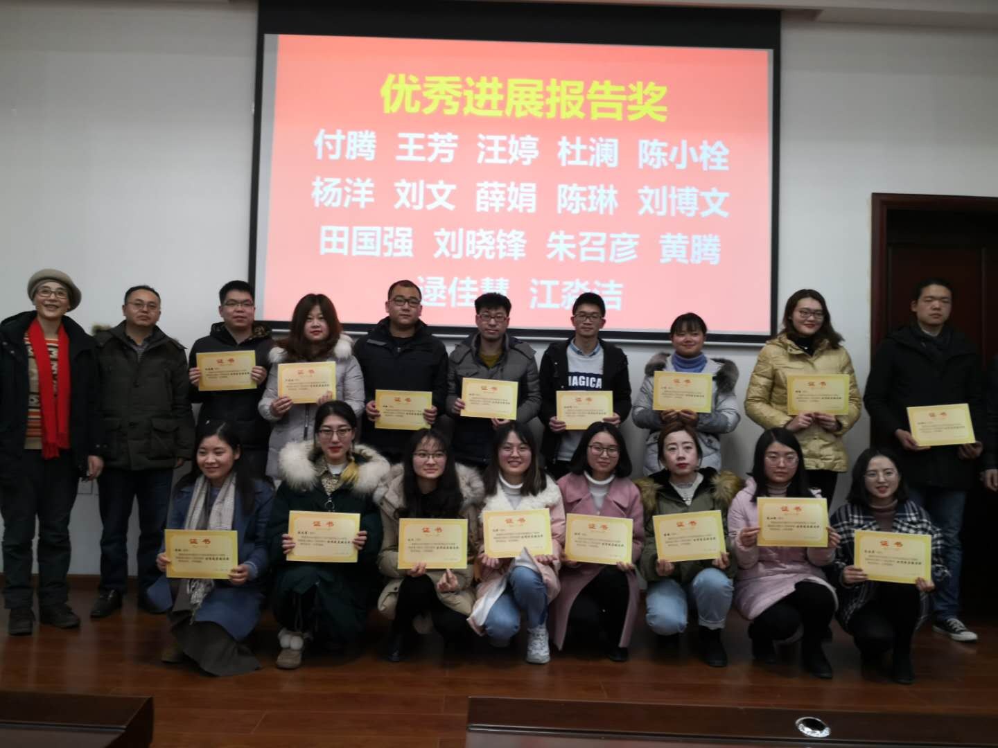 总结会后,环保实验室对2018年度各单项奖获奖人员进行了表彰。各单项奖包括:优秀开题报告奖、优秀进展报告奖、学术活动奖、公益活动奖、文体活动奖、“好师兄/师姐”奖以及实验室主任奖共七项,总计共33人获得了各项奖励。在大家的掌声中,实验室各位老师对获奖同学颁发了荣誉证书,并鼓励大家继续努力,向优秀同学看齐。