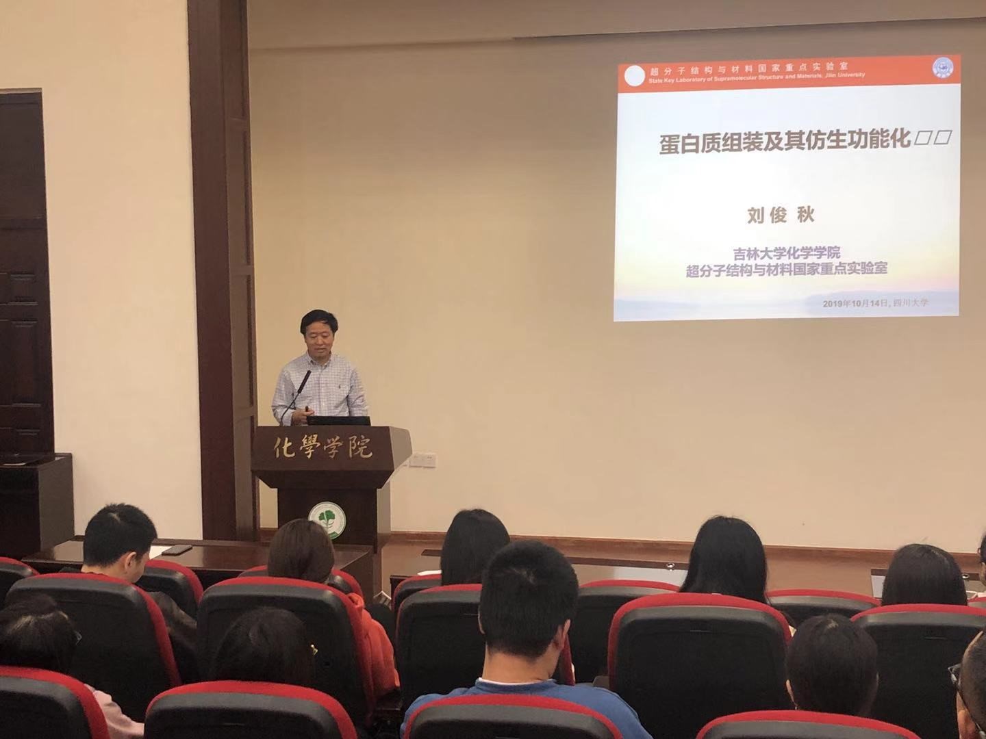 2019年10月15日下午14:30,应四川大学化学学院邀请,吉林大学刘俊秋教授访问我院,并在化学馆321报告厅做了题为“蛋白质组装及其仿生功能化”的学术报告。此次报告由化学学院李坤教授主持,张骥教授、陈善勇副教授和刘艳红等老师及学生参加了此次报告。