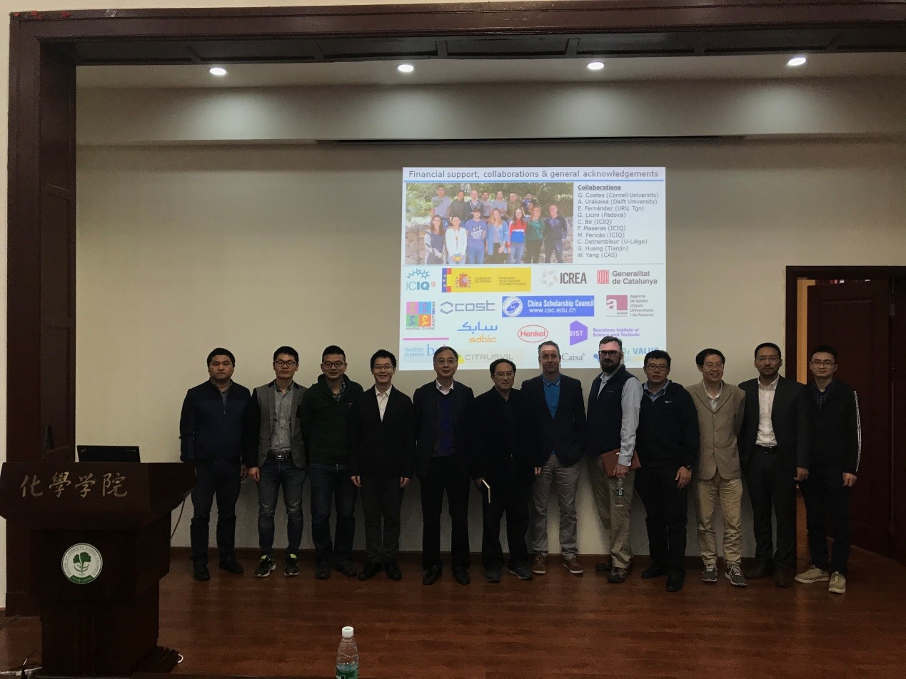 在此次报告中,Arjan W. Kleij教授首先介绍了二氧化碳在环保材料、药物、能量存储、偶联反应等各个领域的应用前景。随后,Arjan W. Kleij教授介绍了他们课题组开发的由二氧化碳转化的有机碳酸酯,并且以此为模版骨架发展了一系列新型反应和实现了可再生化合物和单体的立体选择性转化。整场报告内容丰富,Arjan W. Kleij教授讲解清晰,由浅入深,形象生动地向我们展示了二氧化碳在有机合成方面的重要应用以及在聚合物合成中的巨大潜能。在随后的自由提问环节中,在座师生与Arjan W. Kleij教授进行了深入地讨论交流,大家获益匪浅。报告在全场师生热烈的掌声中落下了帷幕,结束后部分老师与Arjan W. Kleij教授进行了合影留念。