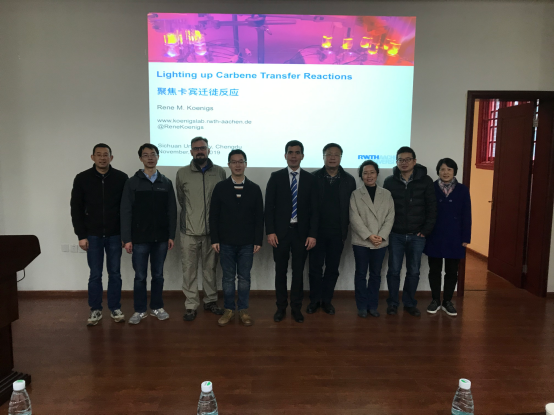 2019年11月21日上午10点,应四川大学化学学院邀请,德国亚琛工业大学Koenigs教授在化学馆321会议室做了题为 “Lighting up carbene transfer reactions” 的学术报告。此次报告由化学学院余达刚教授主持,刘小华教授、周向葛教授、Jason Chruma教授、曾小明教授、郑柯教授和付海燕教授等老师及学生参加了此次报告。